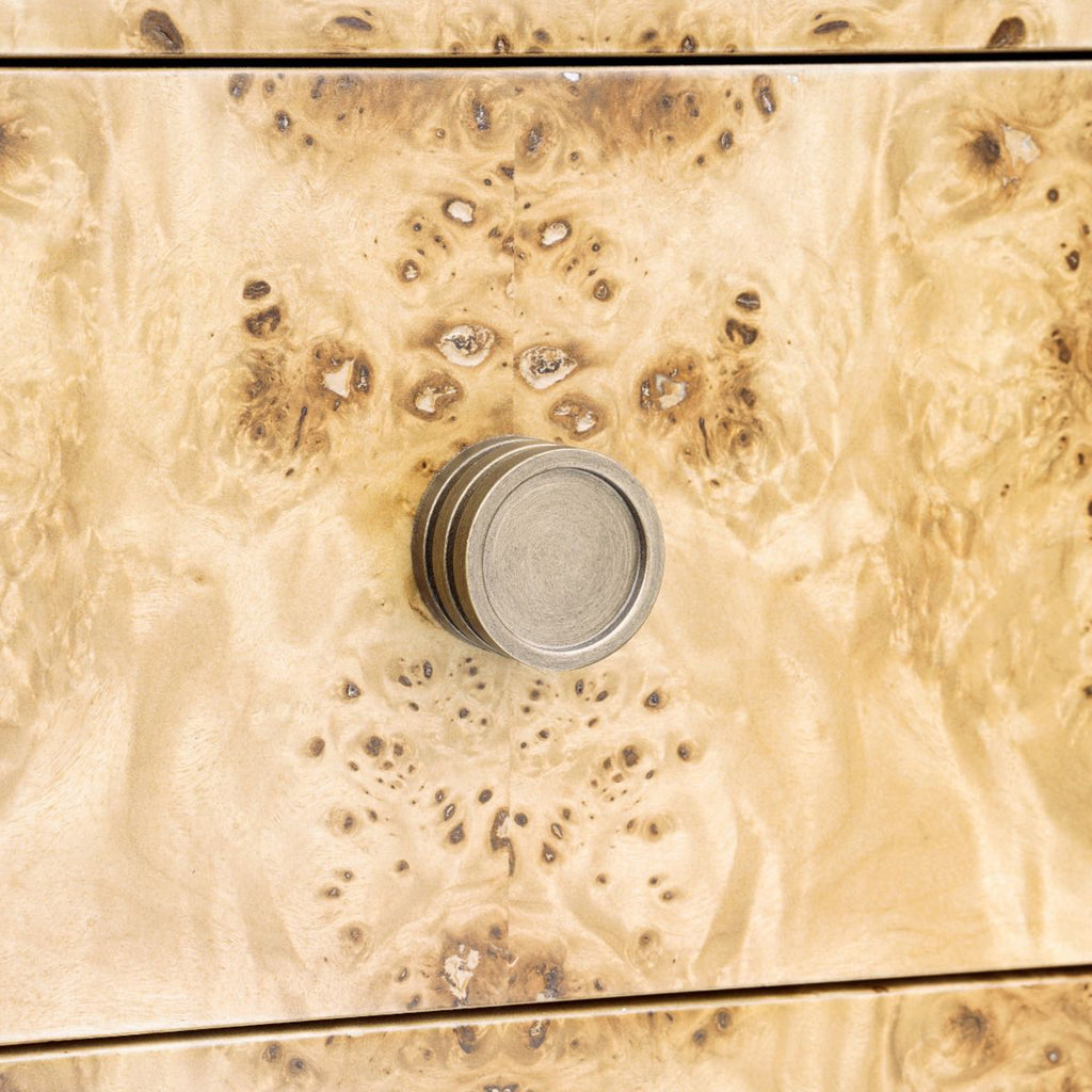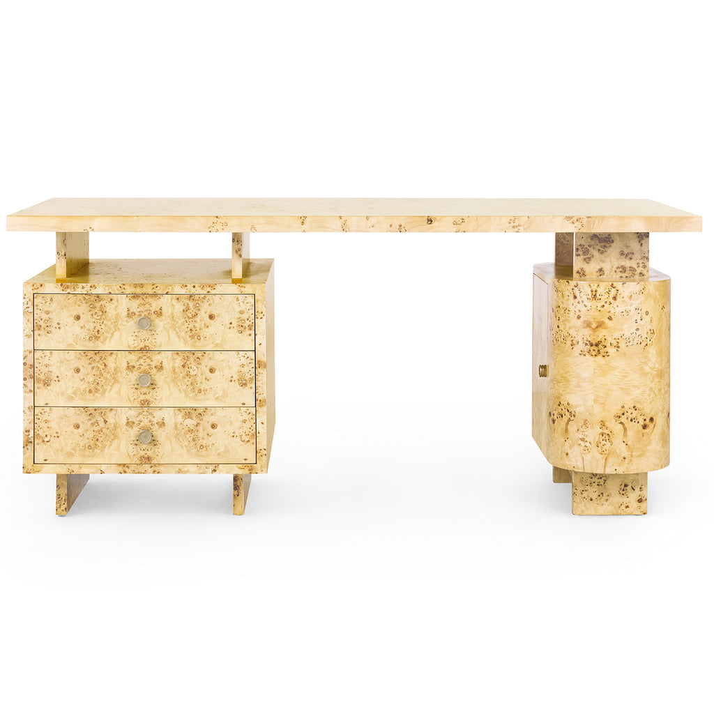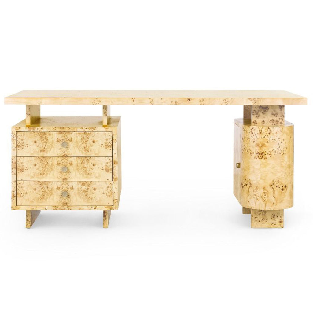 Meet the Villa and House Bernard Desk—an instant showstopper. Its asymmetrical design, clad in sumptuous burlwood and adorned with antique brass hardware, sets it apart. With curved corners, a floating desktop, three drawers, and a petite cabinet, it seamlessly combines form and function. Modernized Art Deco inspiration meets functionality, enhanced by built-in connectivity with two outlets and USB plugs. This versatile piece effortlessly elevates any office or adds a touch of grandeur as an epic bedroom vanity.