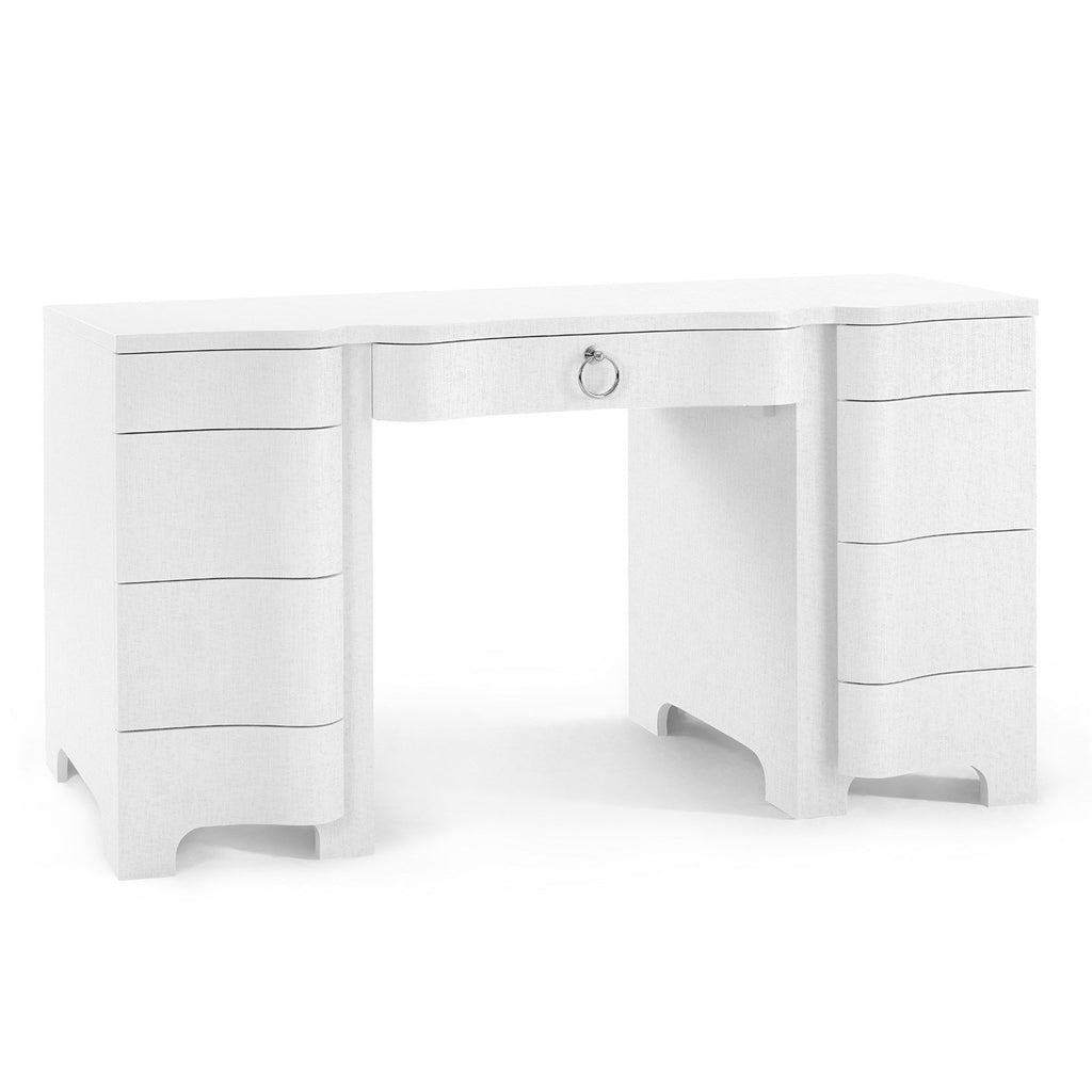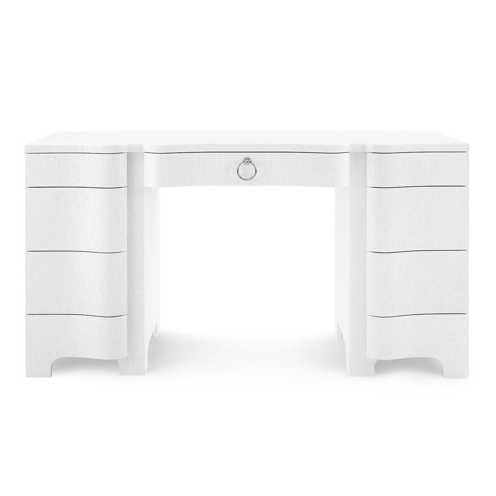 Elegant curvature defines the figure of our Bouquet Desk, a versatile piece whose graceful glamour allows it to function as a traditional desk in a home office or as a spacious vanity in a bedroom. Whether you top it with a makeup mirror or a laptop, the Bouquet is sure to maintain its air of luxury. Lacquered grasscloth has been expertly applied by hand by our artisans, giving the wavy silhouette an extra sense of dynamism, while the seamless construction of its drawers keeps it sleek and subtle. A single adornment—a polished nickel ring pull—pulls it all together like a fine piece of jewelry.