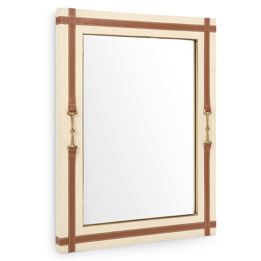 The Villa and House Buckley Mirror exudes equestrian charm through its thoughtful and sophisticated design. The frame is meticulously wrapped in canvas, creating a subtle texture that pairs beautifully with a top-stitched leather ribbon. This elegant detail is accented by two antique brass horse bits, adding a touch of classic chic. Ideal for enhancing both modern and traditional interiors, the Buckley Mirror serves as a refined statement piece with enduring appeal.