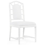 The Villa and House Delia Side Chair is a modern ode to Chinoiserie elegance inspired by Thomas Chippendale's 18th-century designs. Meticulously crafted from solid mahogany and intricately carved to mimic bamboo, it exudes classic refinement. The lacquered finish provides a subtle shine to the structure and fretwork. With a seat back and cushion fitted with linen for maximum comfort, it can be customized with the help of an upholsterer. Elevate your living room or office by using these chairs as striking accent pieces, or bring a touch of timeless style to kitchens or dining rooms by grouping them together.