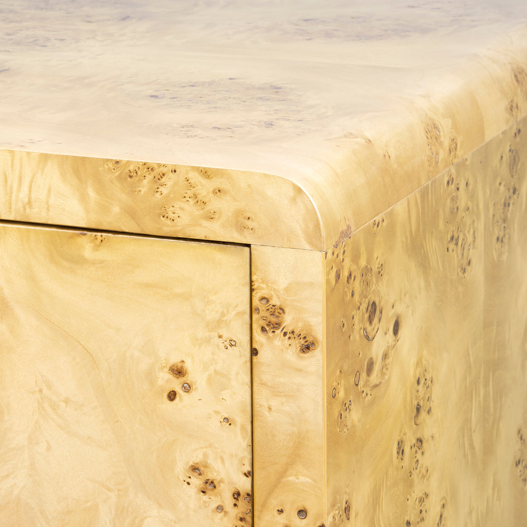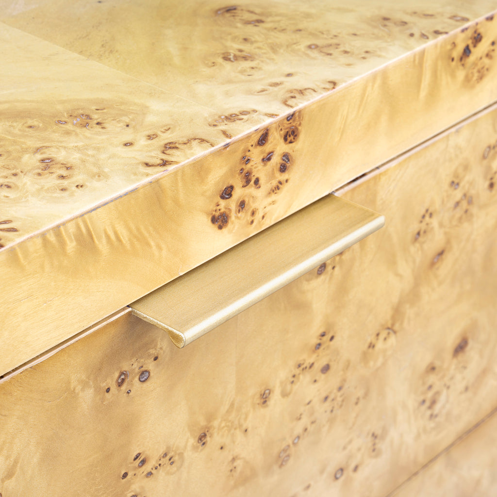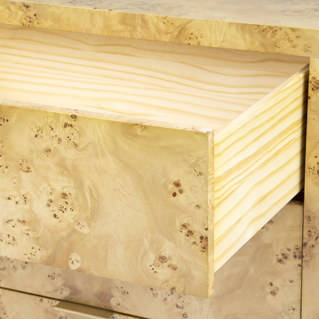 We love our Villa and House Emil Collection for its embrace of retro silhouettes and cosmopolitan style. The naturally vibrant patterns found in burl wood have a distinctively 1970s feel—all kaleidoscopic swirls with a bold sense of cool. The Emil 6-Drawer epitomizes timeless chic. Its seamless, curved design pays homage to the beloved vintage waterfall table style, housing six spacious drawers adorned with brushed brass edge pulls. It effortlessly captures the essence of the era, striking a perfect equilibrium between vintage aesthetics and practical storage. Elevate any space—bedroom, dining room, entryway, or office—with this statement piece that embodies the pinnacle of luxury and functionality.