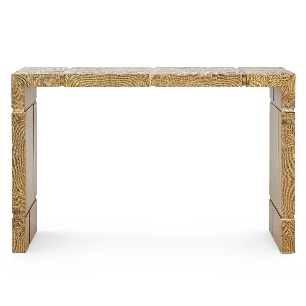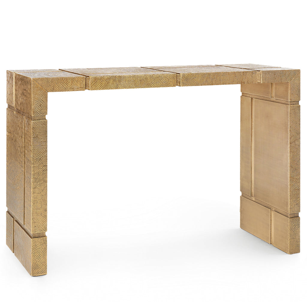 Experience the allure of the Hollis Console Table—an exquisite blend of form and craftsmanship that transcends the ordinary. Its captivating waterfall silhouette, meticulously hand-crafted from brass cladding with a darkened antique finish, commands attention in any space. Adorned with a geometric pattern, created by a series of precisely constructed linear recesses, it exudes sophistication and depth. The elaborate hand-hammered design on its surface adds decorative flair and tactile intrigue, forming a mesmerizing effect. Whether adorning a softly decorated entryway or complementing modern industrial schemes, the Hollis Console Table effortlessly infuses structured shape and timeless elegance into your interior design vision.