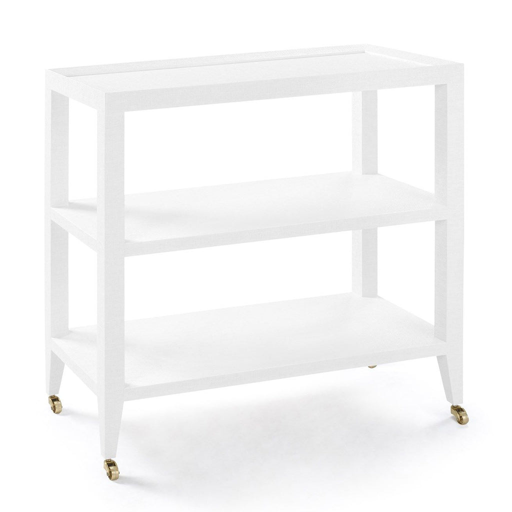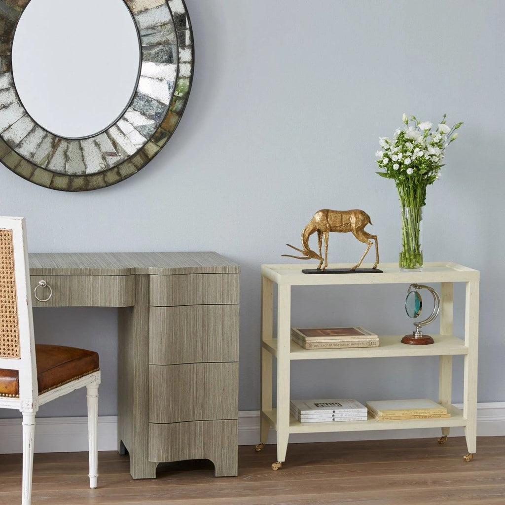 The Isadora Collection is a designer’s response to modernism’s principles while proposing the importance of texture, pattern and luxury to livability. This large collection is in the spirit of Karl Springer. The design has a gallery edge, inset sculptural legs, brass wheels and useful shelves.