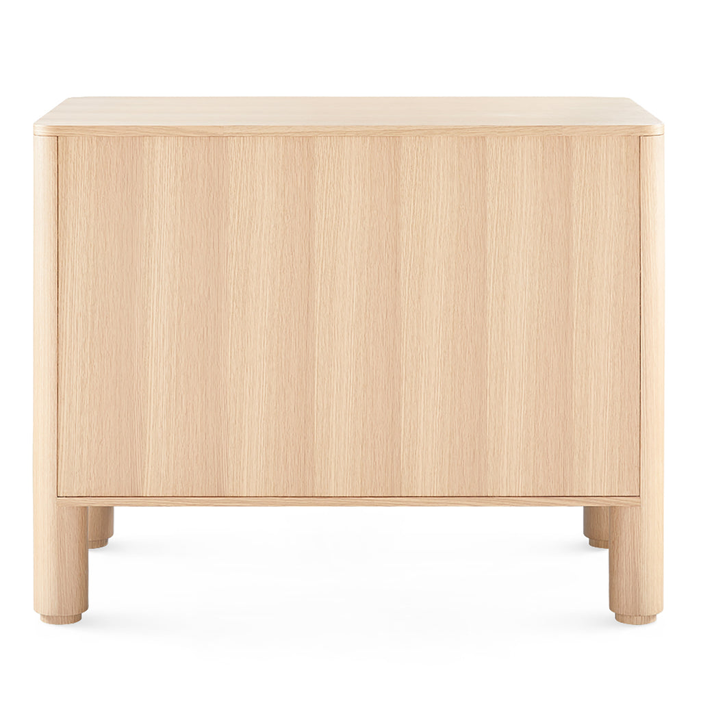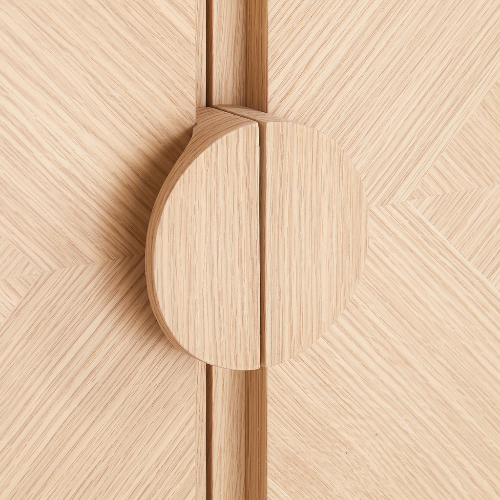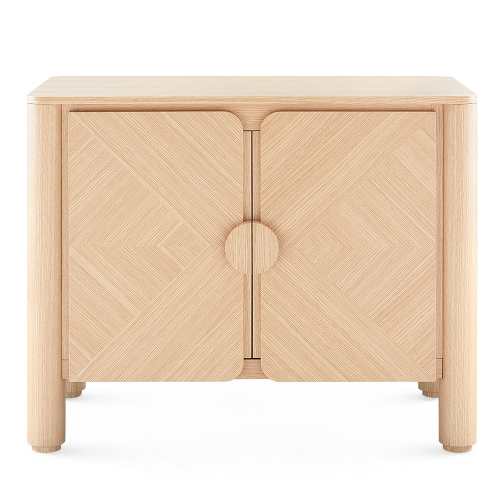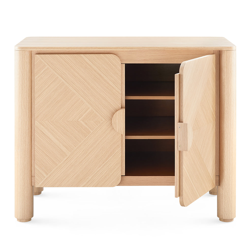 The Villa and House Nolan Cabinet is expertly crafted from European white oak veneer with a sleek clear lacquer finish. Its bold, curved, and chunky elements draw inspiration from 1970s-80s California design, offering a retro yet refined look. The front showcases a stunning chevron wood grain pattern, adding a texture and a touch of refinement. Resting on recessed feet, the cabinet exudes both timeless style and modern functionality.