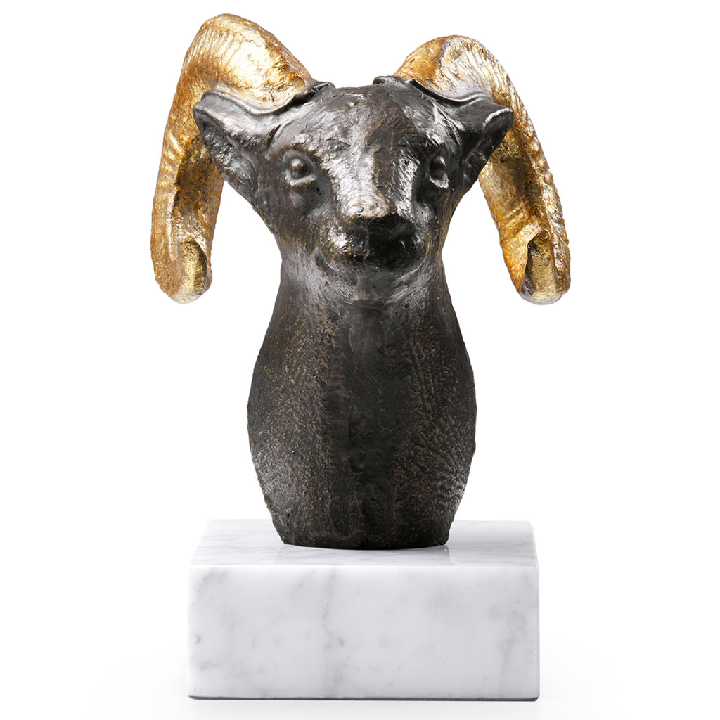 Sitting atop a base of white marble, the Ram Statue is finished in bronze with horns adorned in gold leaf. The statue exudes luxury while imparting the alluring mysteriousness of a gorgeous archeological artifact. Perfect for a library or office, it adds a dapper touch of sophistication to any space. Alternatively, use it as a pair of bookends to elevate your living room décor.