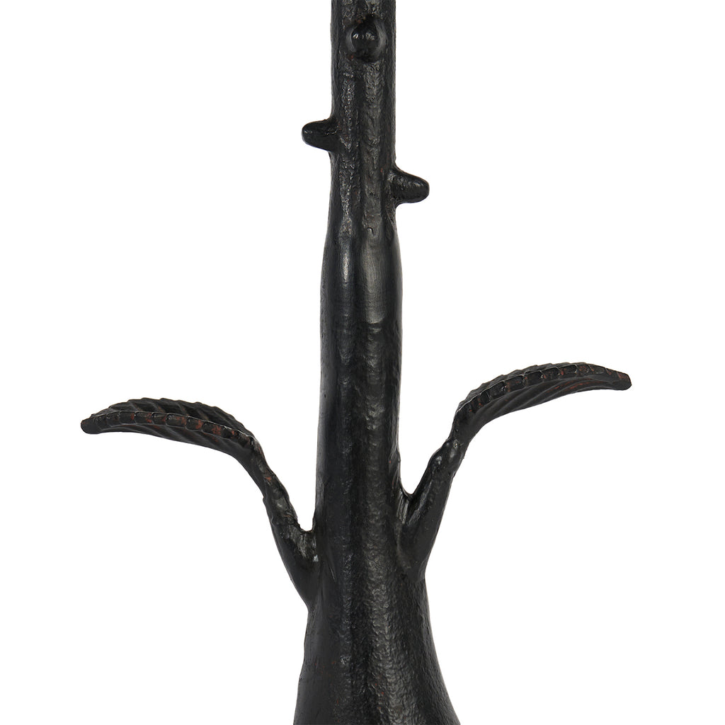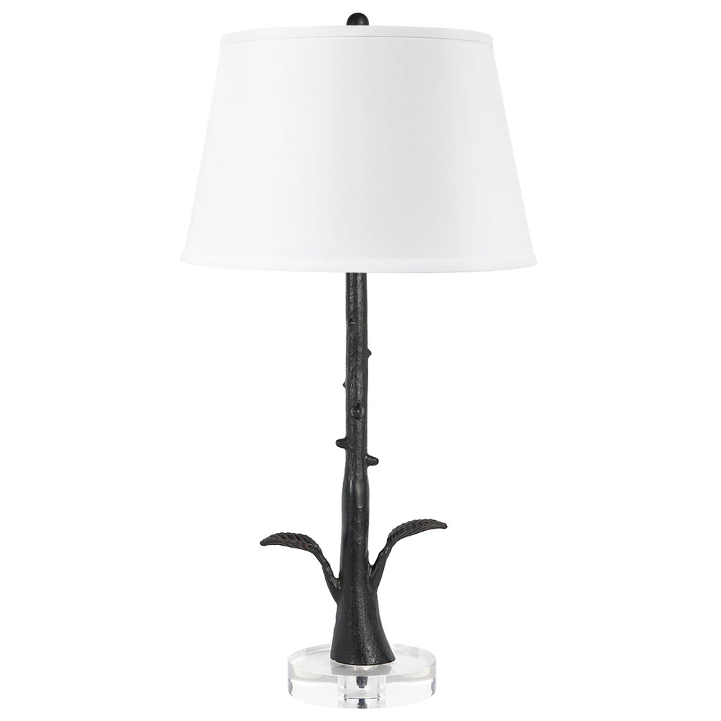 The Villa and House Rama Lamp brings the beauty of nature indoors with its branch-like design. Featuring two leaves sprouting from the base and several organic knots accenting the neck, it captures the essence of natural growth and texture. Hand-cast and finished in blackened bronze, the lamp exudes artisanal craftsmanship and timeless appeal. Resting on a clear acrylic base, the Rama Lamp is a lovely nature-inspired accent, perfect for adding an organic touch to any space.
