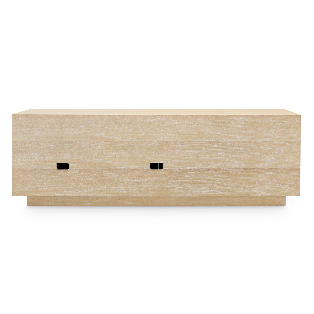 Crafted from solid oak, the Villa and House Simon 3 Drawer & 4 Door Cabinet exudes a timeless elegance that will captivate your senses. The organic grain patterns and rich hues of the wood create a warm and inviting ambiance, while the Clear Lacquered Silky Grasscloth adds a touch of refined texture. Designed to make a statement, this piece sits proudly on a platform base of Cerused Oak, showcasing its sleek and modern silhouette. The cutouts, cleverly integrated into the design, not only serve as pulls for the drawers and doors but also expose the same beautiful wood, creating a harmonious and seamless aesthetic. The versatility of this cabinet complements a variety of spaces, whether it be a living room, family room, library, or bedroom. Its modern appeal seamlessly blends with any interior decor style, from contemporary and minimalist to transitional and eclectic.