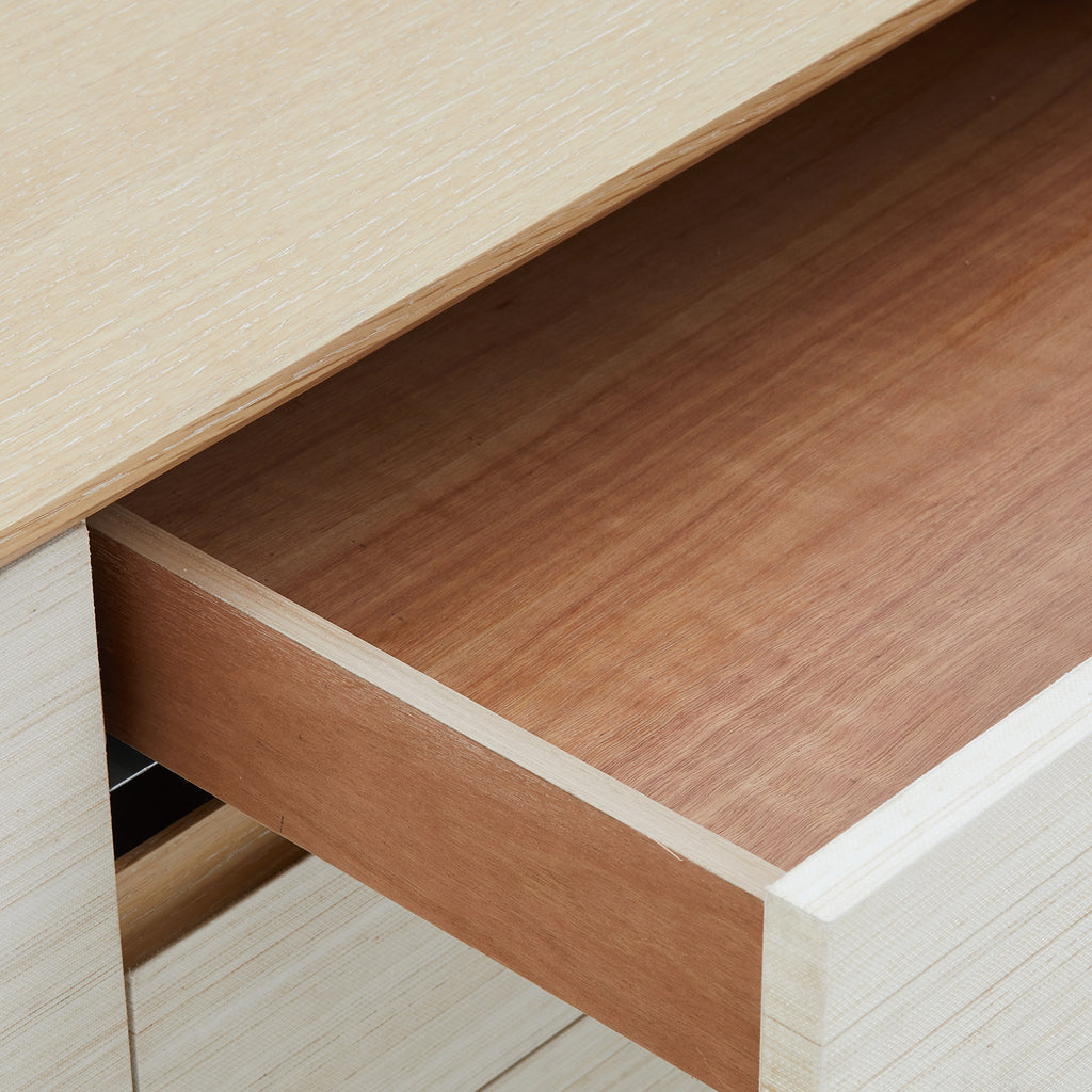 • Material: Clear Lacquered Silky Grasscloth & Natural Cerused Oak Veneer Interior