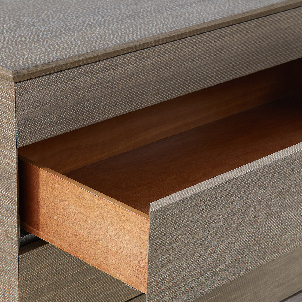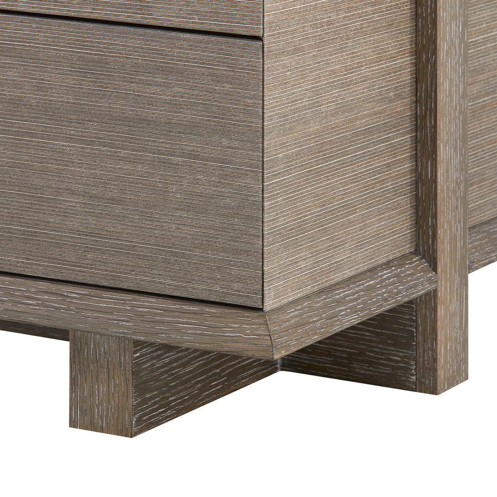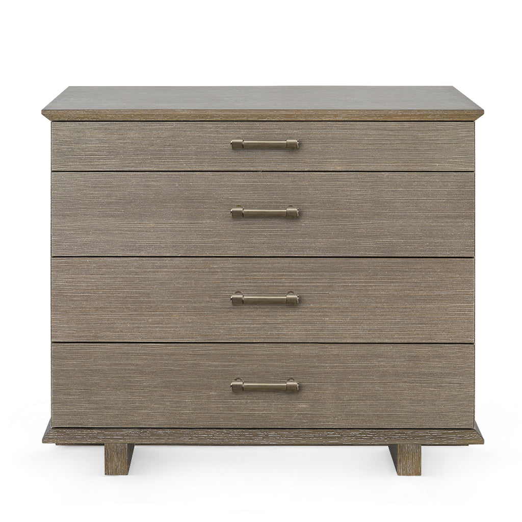 The Villa and House Watson Collection showcases a custom shimmer grasscloth in an elegant gray-brown tone, offering a sleek, modern aesthetic with a bold, masculine appeal. It features unique cast bronze bar pulls that enhance its striking design. With four spacious drawers on soft-closing glides, this collection blends contemporary sophistication with rich textures, making it an eye-catching addition to any space.