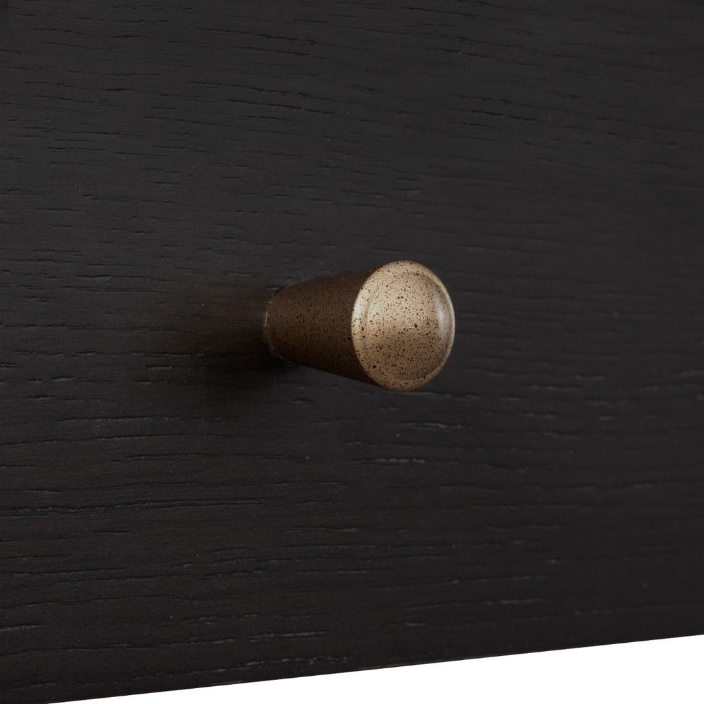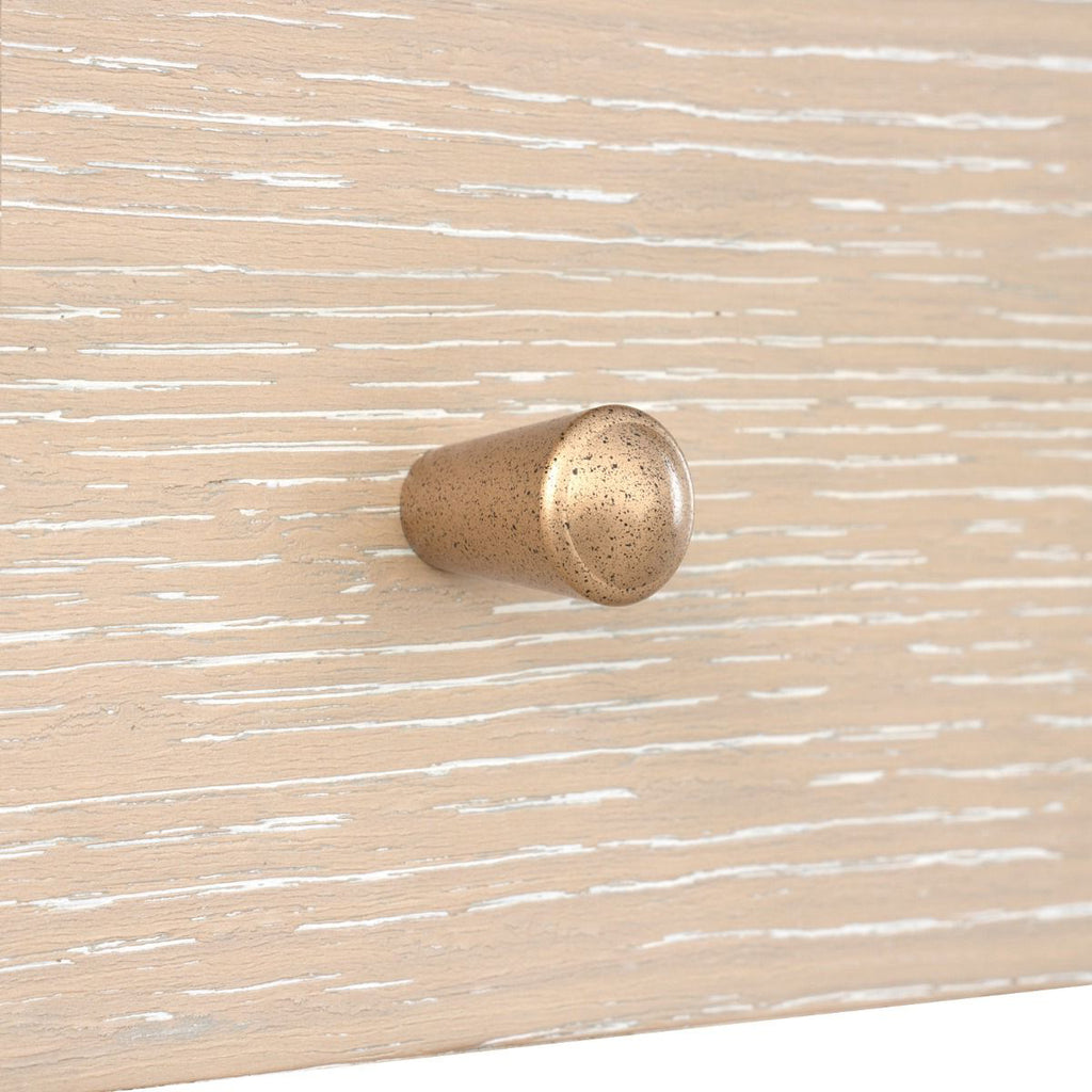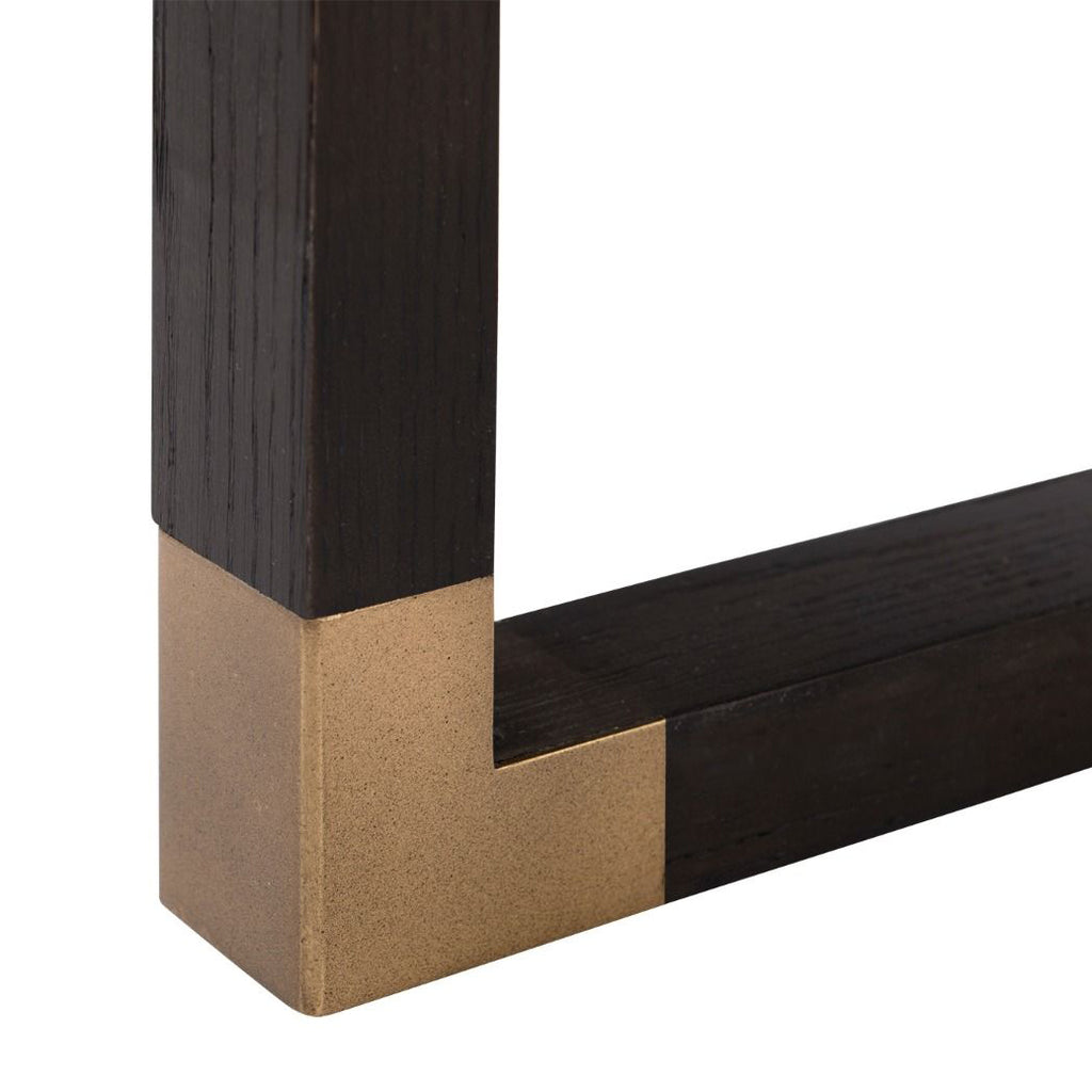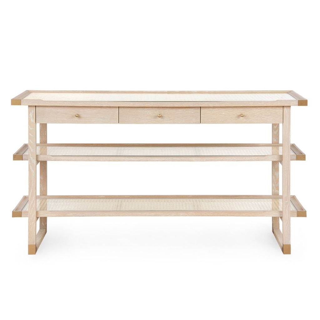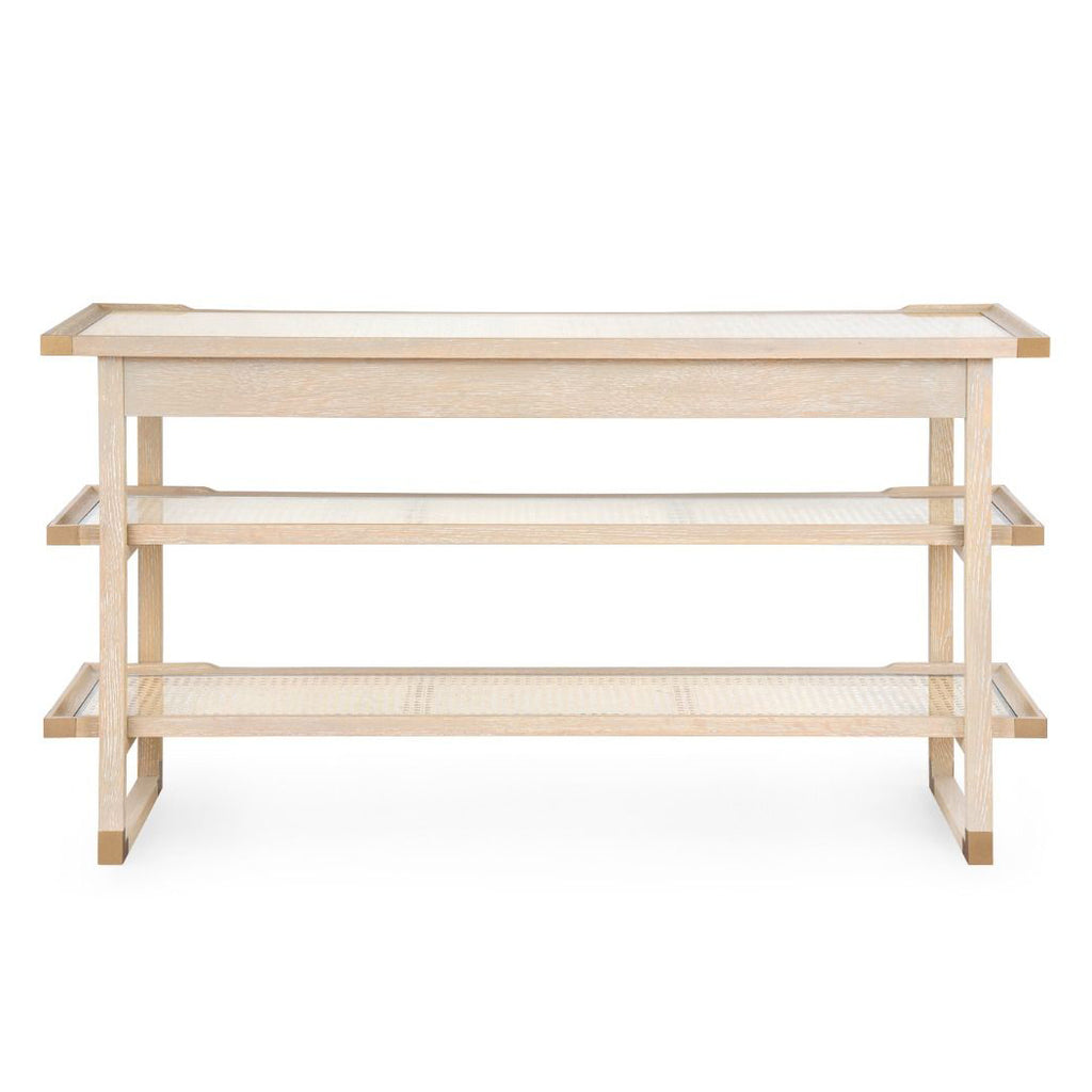 The Austin collection is influenced by traditional Japanese furniture design which emphasizes simplicity, natural materials, and understated natural finishes. The silhouette is reminiscent of traditional Japanese architecture with strong horizontal elements, while the hand-woven cane shelving, bronze-accented corners, and hand-carved grooving, which surrounds the top, speak of fine workmanship. Integrated concealed drawers maintain the integrity of the design and the glass shelving sits atop the woven cane protecting it and imparting airiness to the piece.