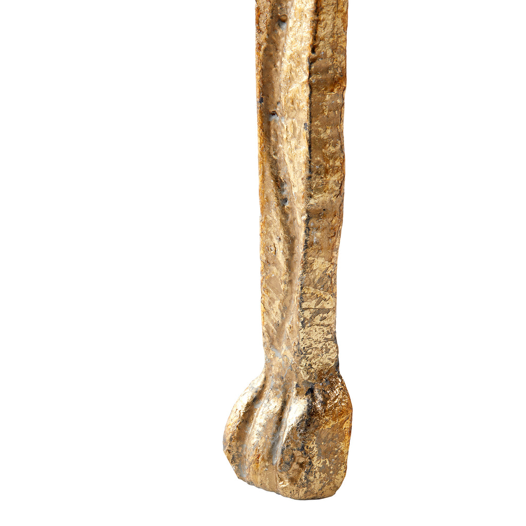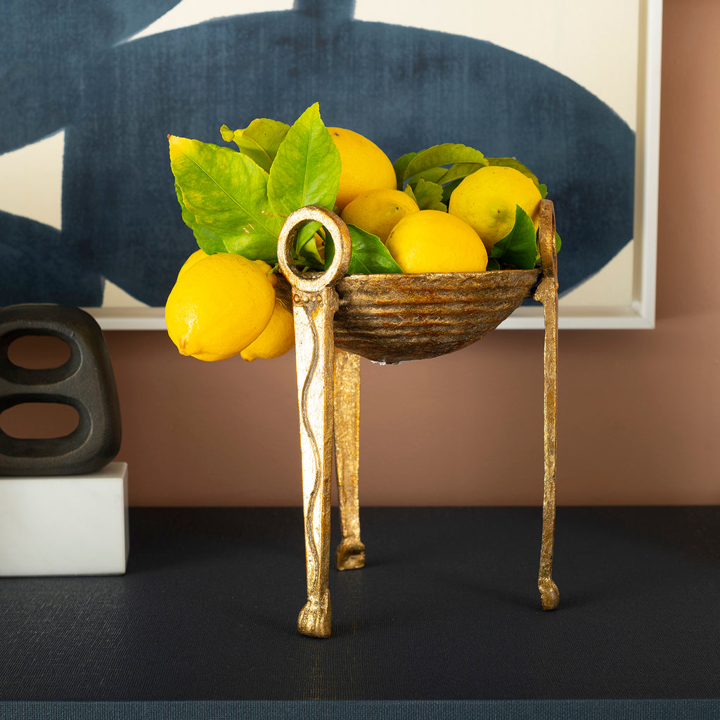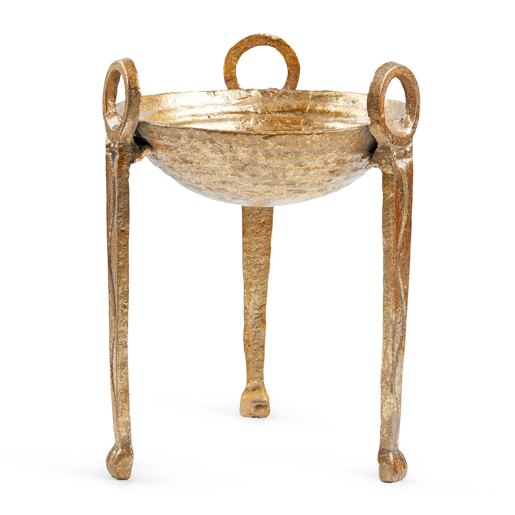 The Nestor Tripod, is modeled after ancient Greek and it possesses a timeless design appeal. It is simple, elegant, modern and ancient at the same time. This piece is made of cast metal and finished with hand-applied gold leaf. The original model was used for lighting, so we recommend using it to hold a votive candle, burn incense, place an orchid or keep trinkets or offerings. The Nestor tripod would work beautifully on a living room mantel or two could make a wonderful pairing on an entryway console.