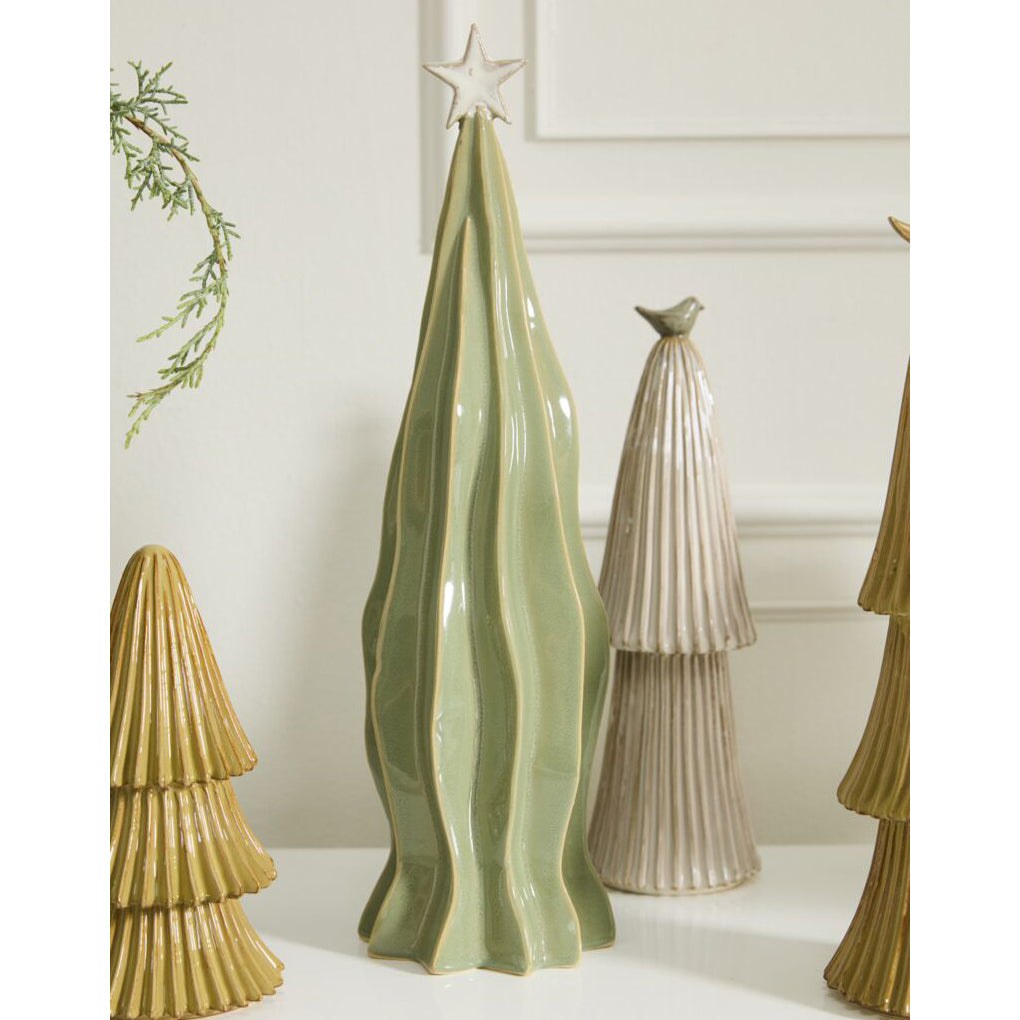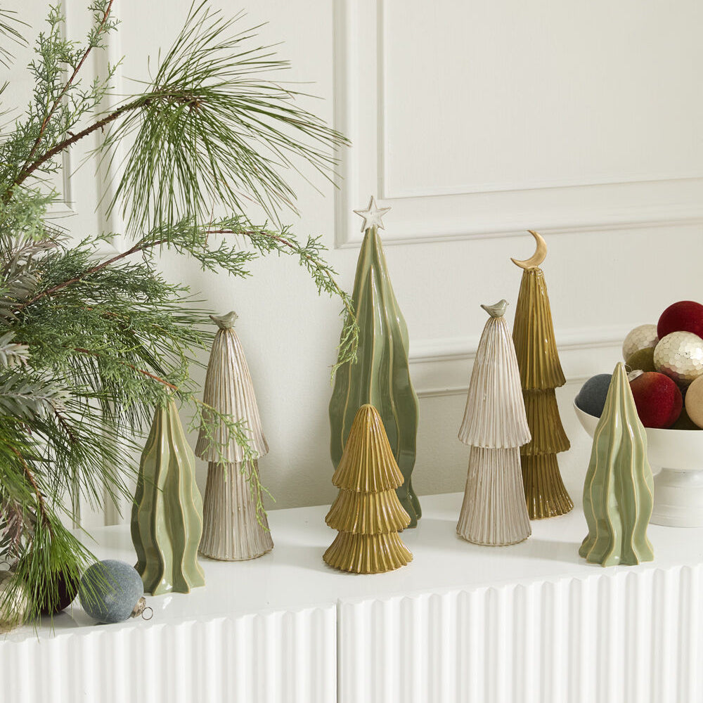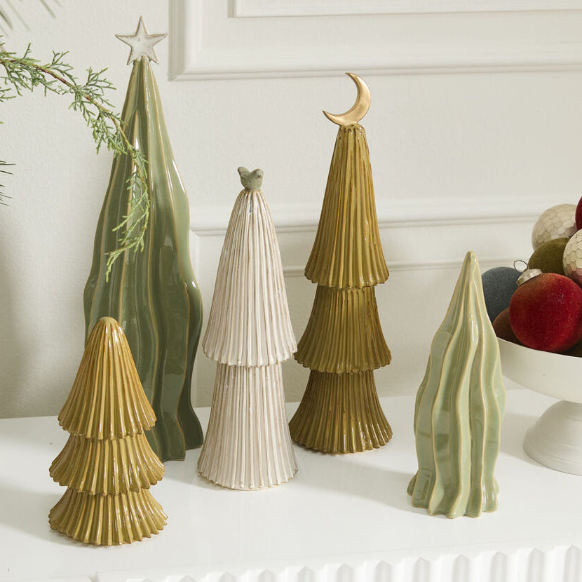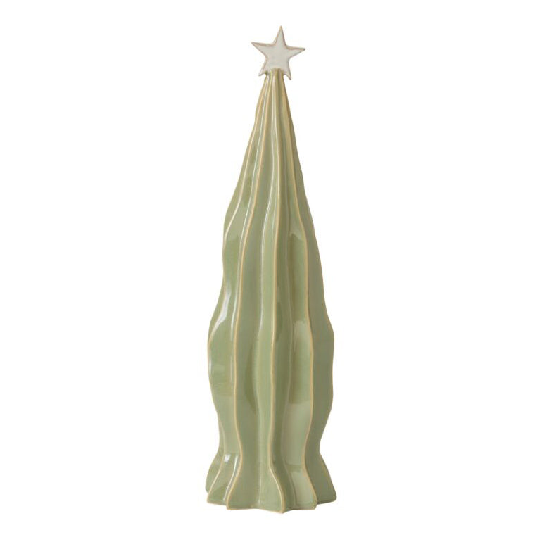 Make holiday memories by creating a winter wonderland with the Village Tree, a charmingly artful ceramic tree that features a stacked design, each layer detailed with vertical ridging. This hand-painted tree is a beautiful shade of soft ochre, and hints of natural bisque peek out at the edges of the tree details. Style with the other Village Collection trees and houses for a layered holiday display.