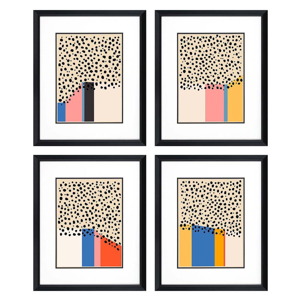 Colorful stripes converge with dots in geometric fashion. Matted in white and framed in a contemporary black finish molding. Sold as set of four.