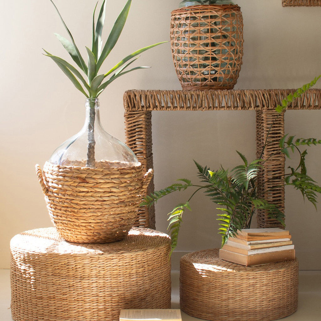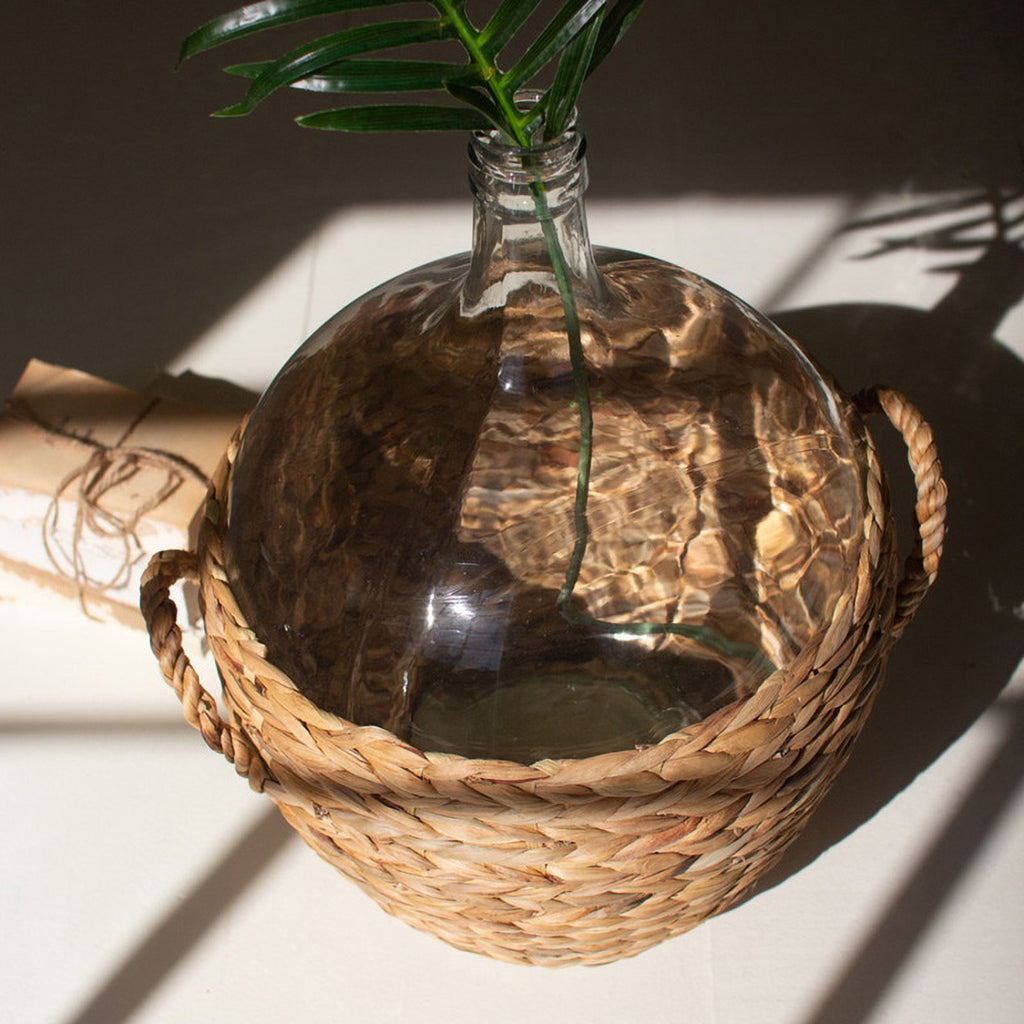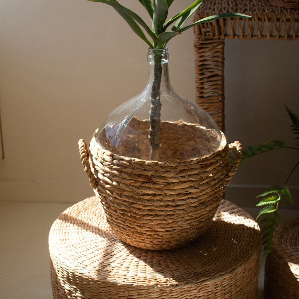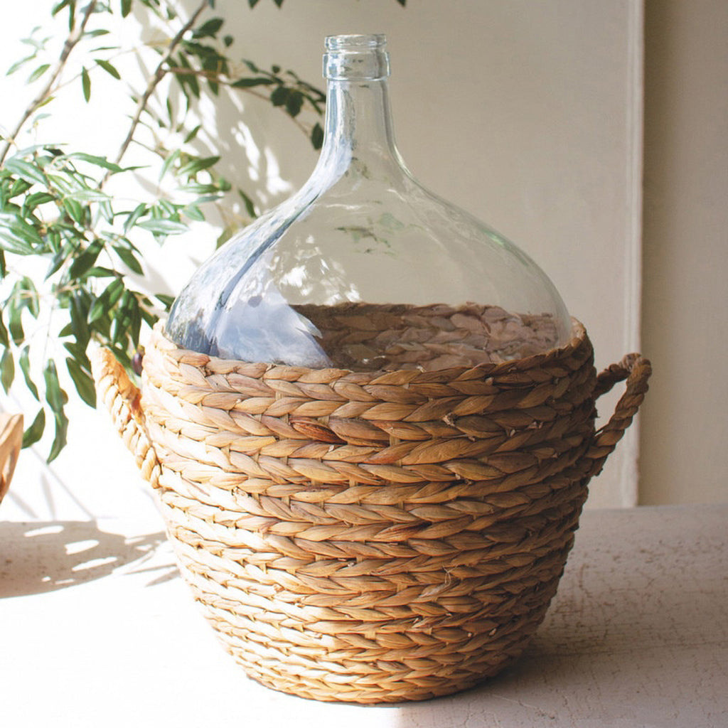 This 22in tall water hyacinth-wrapped glass wine damigiana is made for entertaining. Throw in a few sprigs of something into this vase or enjoy the simple beauty alone. Make it a centerpiece or an eye-catching shelf sitter.