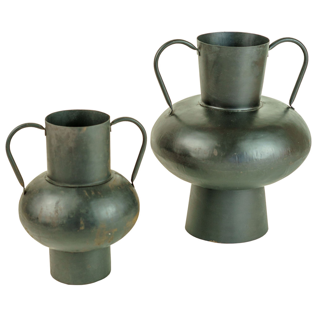These metal urns with handles offer a modern and simple look to any table! Once you add a plant it is sure to brighten up a room and draw one's attention to it.