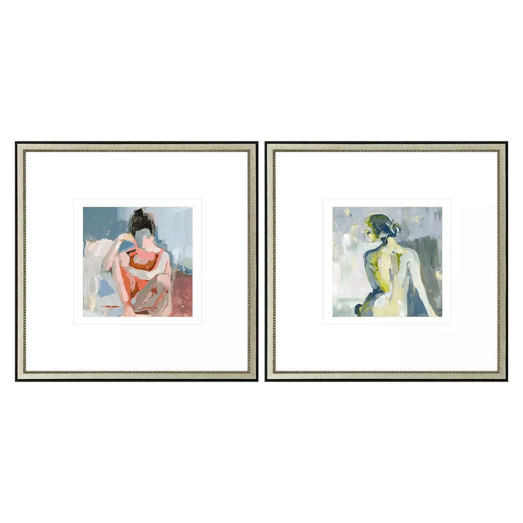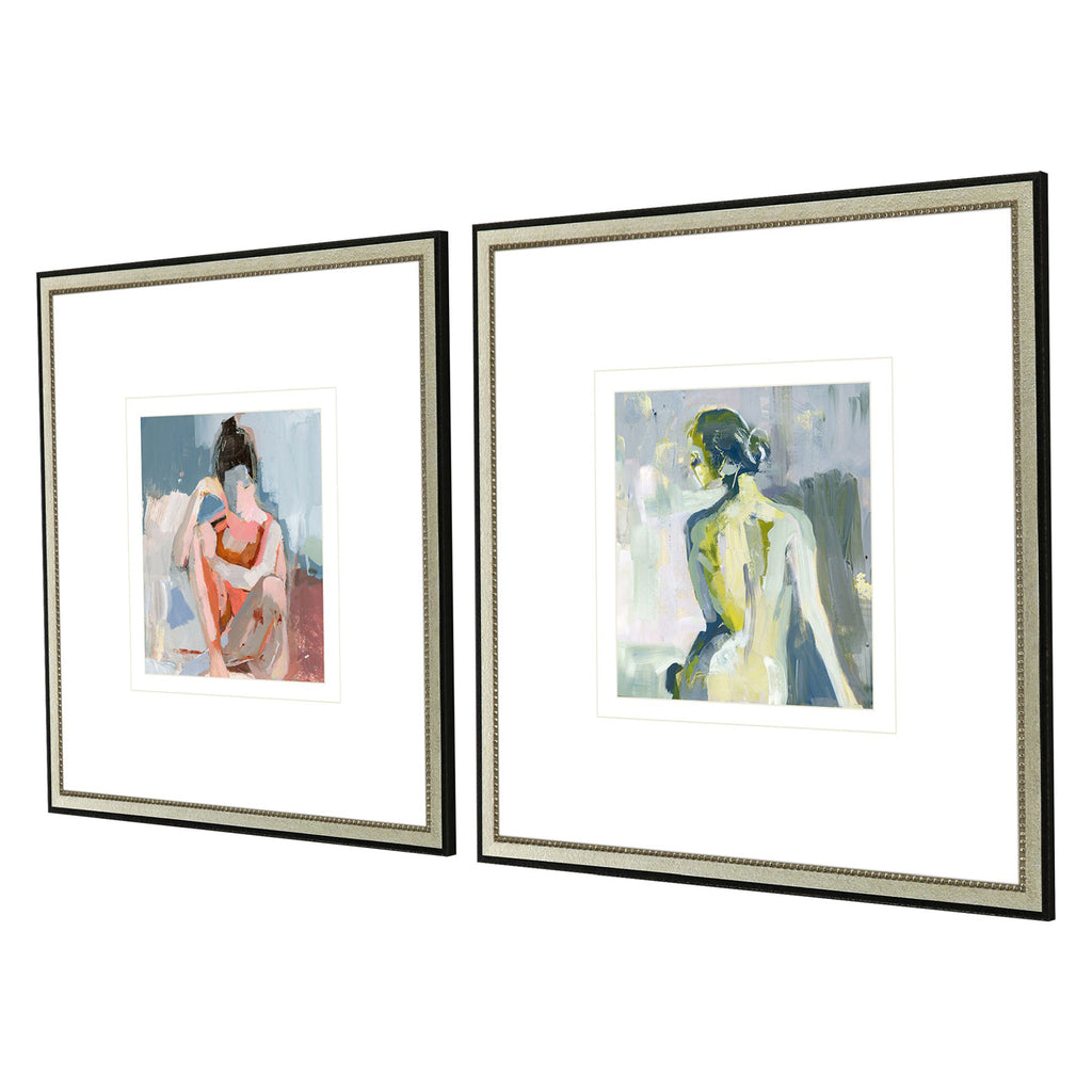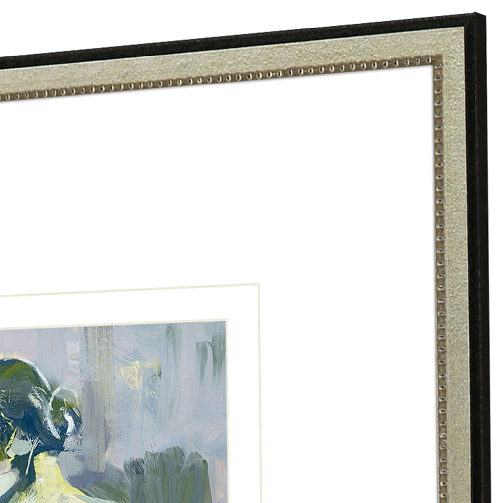Abstract figures are double-matted in white. Framed in a traditional step profile wood with distressed silver leaf and beaded lip with black edging.