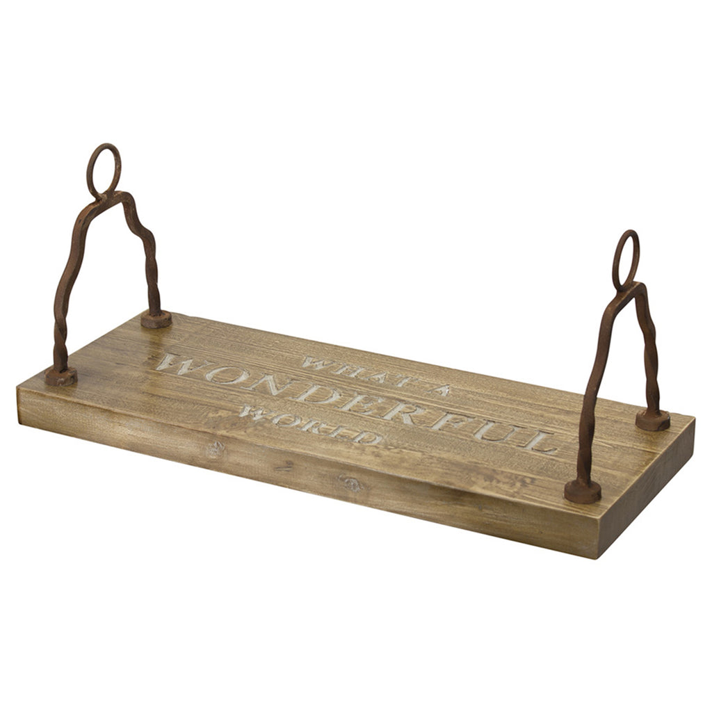 This Wonderful World Swing is a decor fun addition for your family and friends to enjoy in your yard. Featuring the sentiment "What a Wonderful World", the natural poplar wood seat paired with the rustic iron handles is the perfect combination to create a stunning display. Hang the swing from a tree branch in your yard or garden (rope not included). Reccommended for adult use and child supervised use.