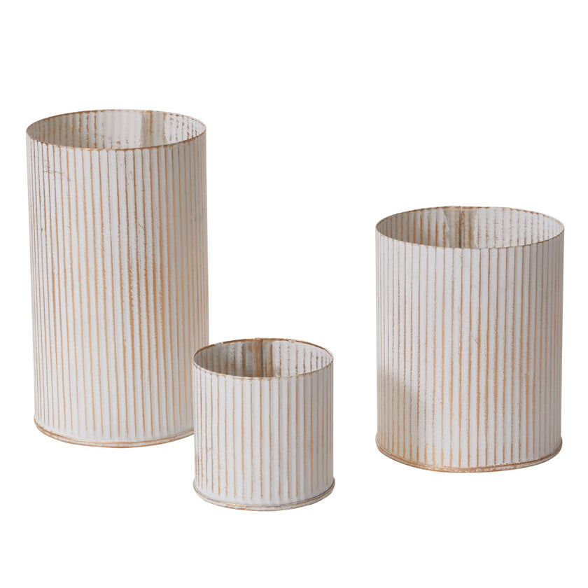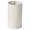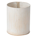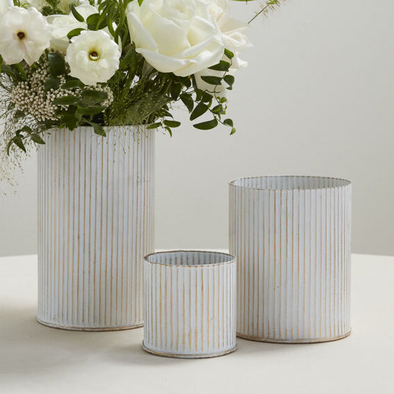 Bring rustic charm, a neutral tone, & a classic shape to table settings with the metal cylinder Whitewashed Norah Vase. Made from lightweight aluminum sheet metal with a vertical ribbed design & a brushed-on distressed white finish, this small vase offers a down-to-earth, chic look for everyday floral delivery or wedding & event design. Sealed to be watertight, this makes a stunning centerpiece filled with fresh florals.