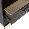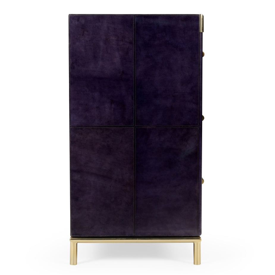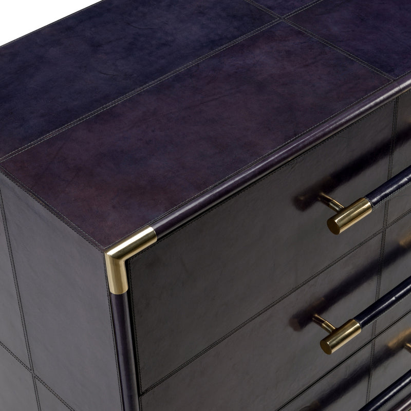 This chest from Wildwood elevates any room with simple, gorgeous glamor. Perfect for storing your favorite accessories, this chic furnishing adds a sophisticated touch while offering everyday function. The Wildwood Bruce Blue console table with 3 drawers is wrapped in a Navy Blue leather and accented with a touch of Brass on the drawers. the size is perfect for bedside chests or for a more masculine or nautical motif.