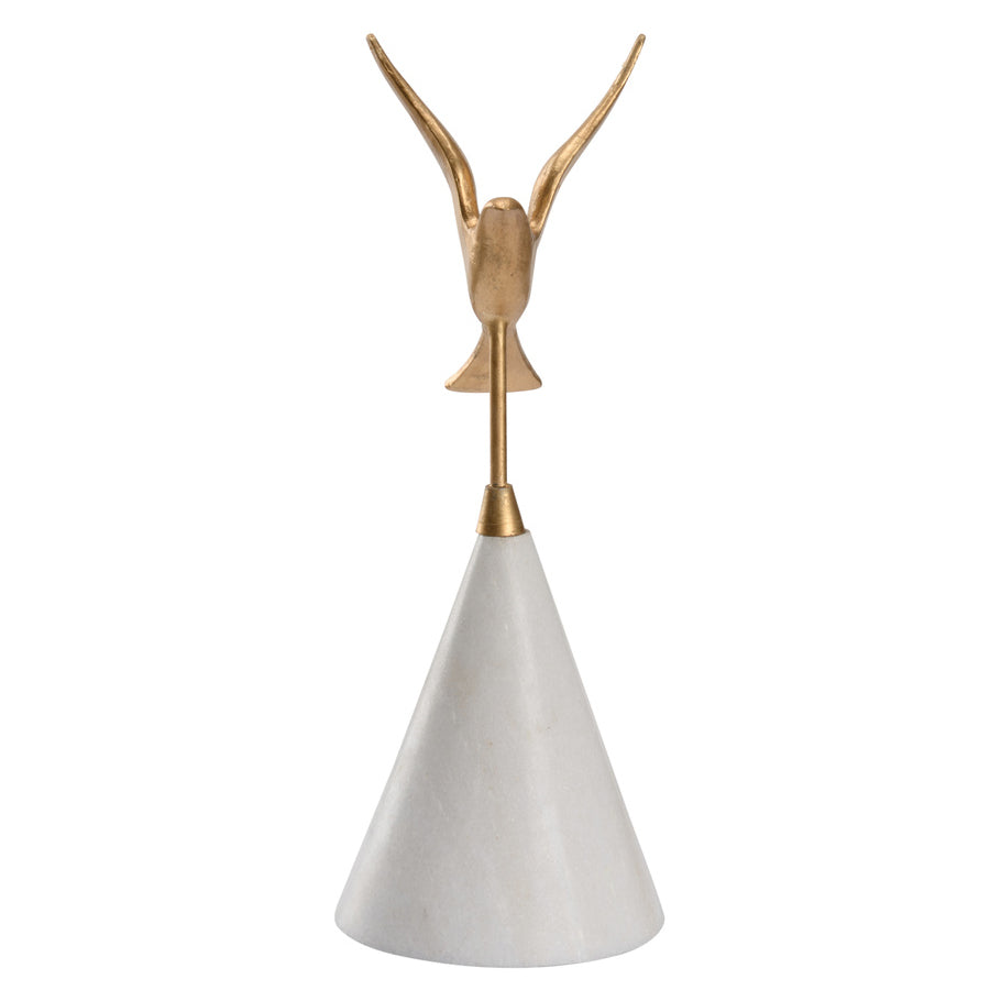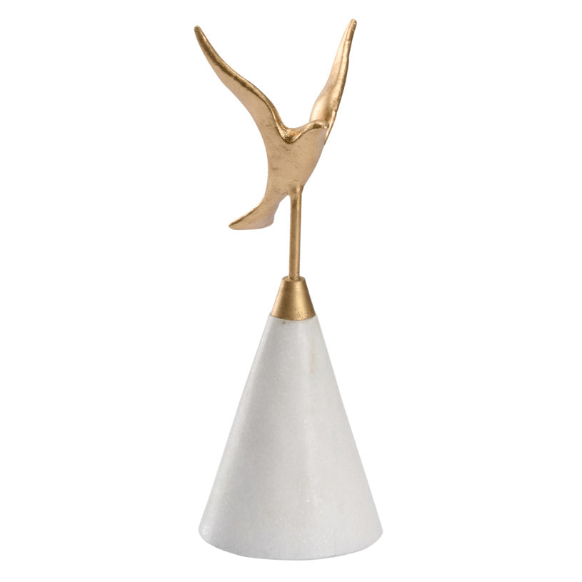 This elegant bird sculpture is the optimum choice for the nature lover. Flights of fancy features a cast iron bird with a metallic gold finish that is in flight over a natural white marble base. Ideal for displaying on tabletops or etageres in your contemporary home.