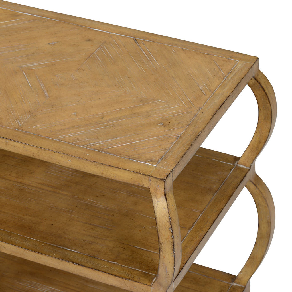 This table from Wildwood brings lavish texture to a bedroom or living room. A handsome furnishing to serve as a surface for a lamp or books, this table expresses chic style. Gray, honey or teal painted finish on bamboo laminate tiered table.