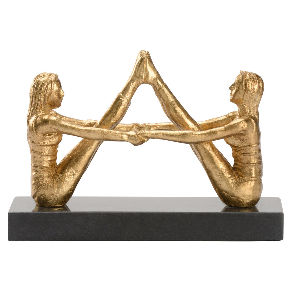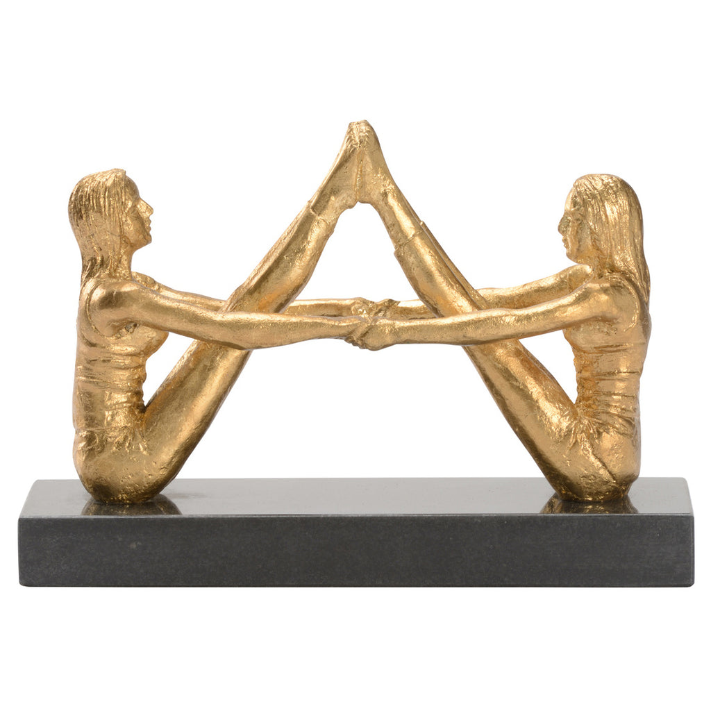 Designed for the yoga enthusiasts, this handcrafted sculpture features two women in navasana or boat pose. This metallic gold, cast iron accent will complement the existing decor in your home or yoga studio.