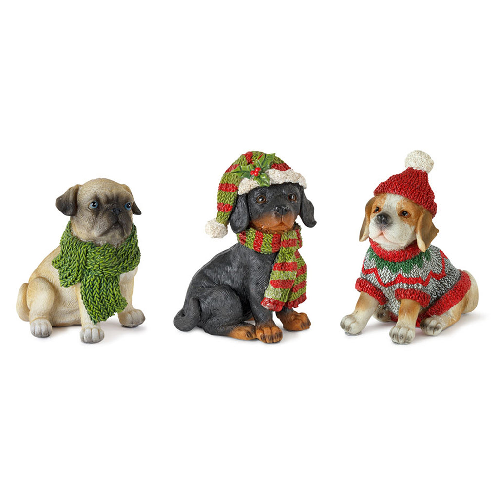 Add a whimsical touch to your holiday home decor with this adorable set of Winter Dog Figurines. Featuring three assorted dog designs, the furry friends included in this set are the pug, dachshund, and beagle. The brightly colored hats and scarved paired with the realistic painted finish the the perfect combination to create a beautiful Christmas piece. Display the pieces together to make a statement, or display along with other decor to spread the holiday cheer.