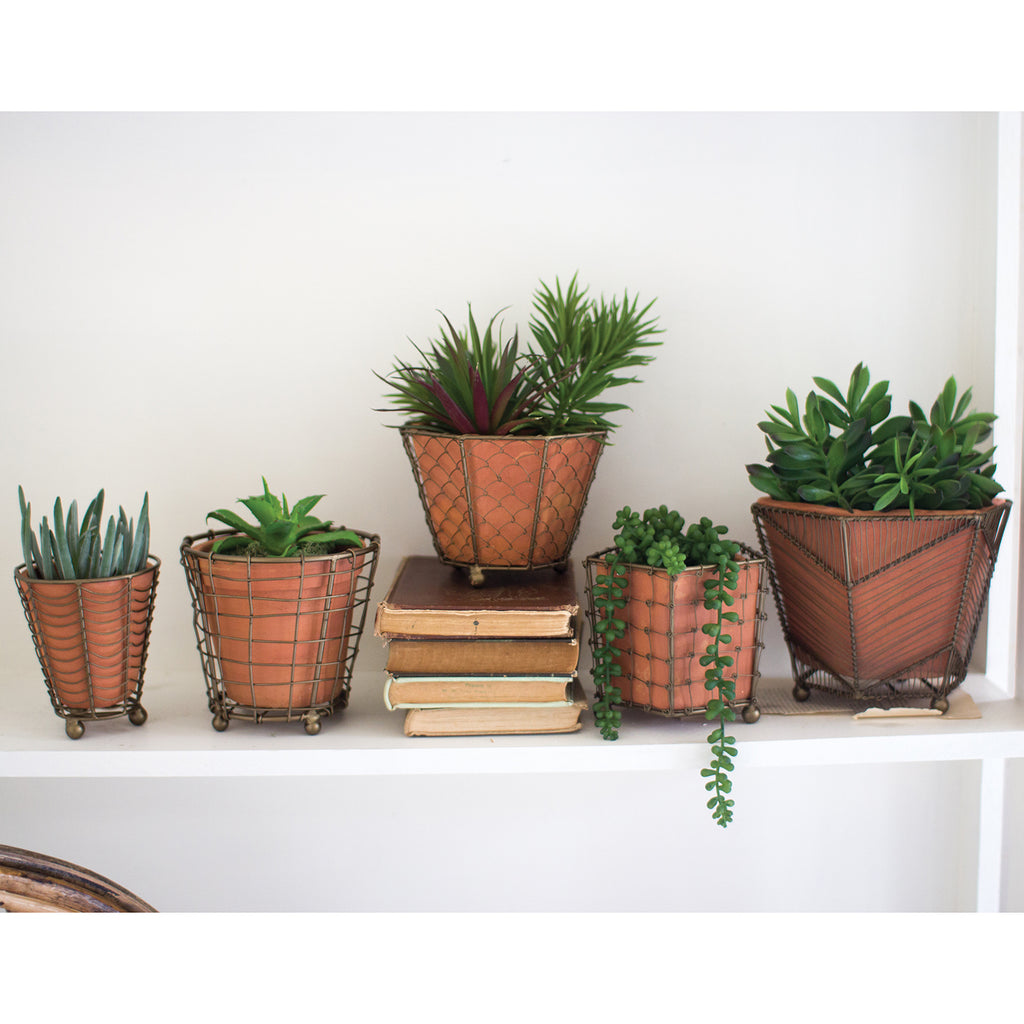 This classy set of five terracotta planters with wire wrap and brass detail is perfect displayed as a grouping or spread around the home. one each design one each design