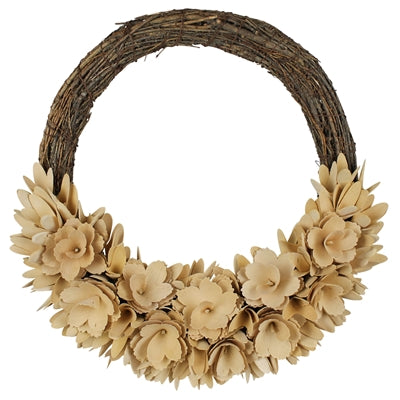 Flowers made of natural wood shavings are arranged in an asymmetrical gathering to create an all season decoration for doors, windows or walls.