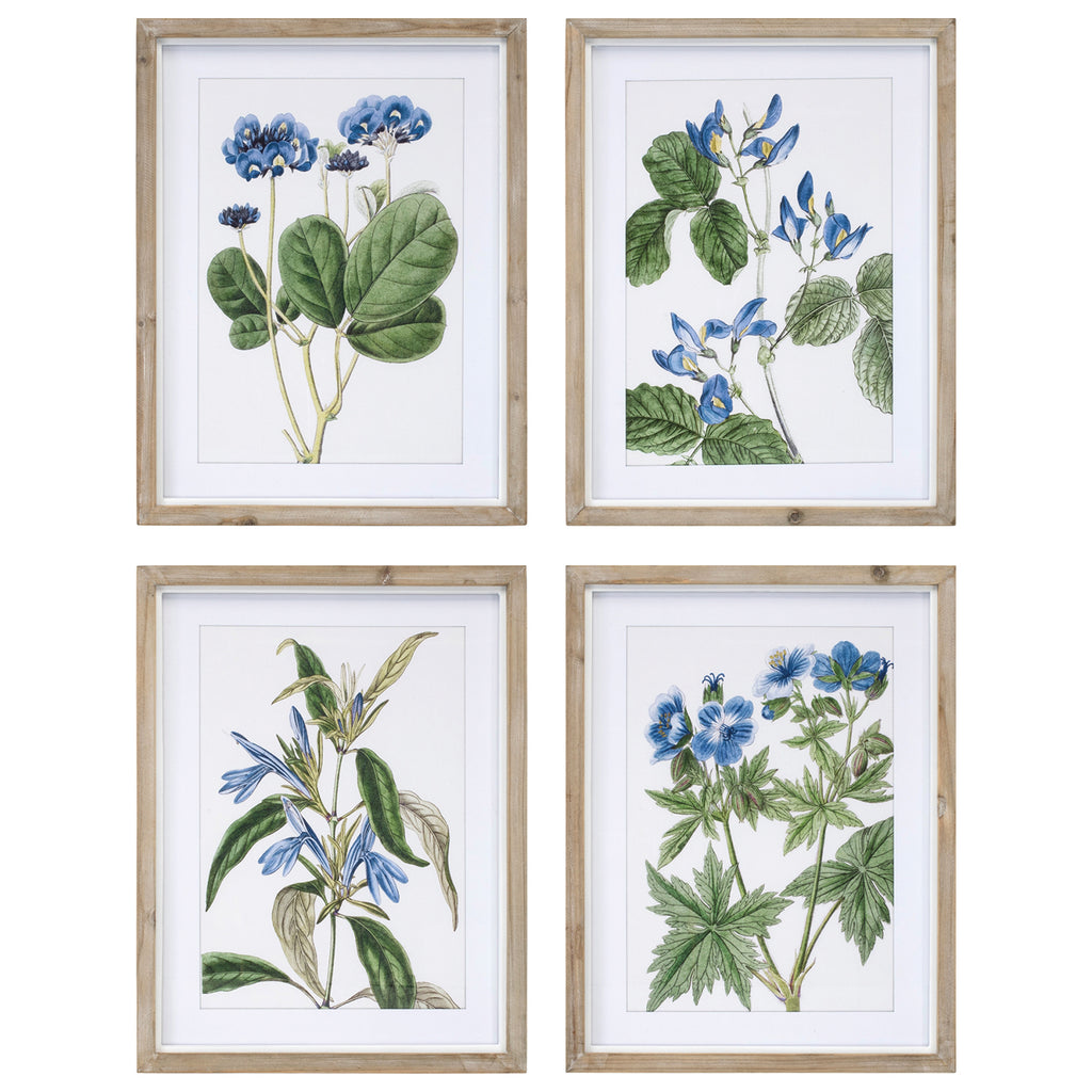 Adorn the walls of your home with this stunning set of Floral Prints. Featuring four assorted designs, this set is a great fit for your country cottage or garden chic style of decor. The cool blue and green tones paired with the natural fir wood frame and painted floral artwork are perfect to create a memorable display. The quality wood and paper composition under glass is sure to endure for seasons to come. Arrange these pieces together to make a statement, or hang them in different rooms to enhance your living space.