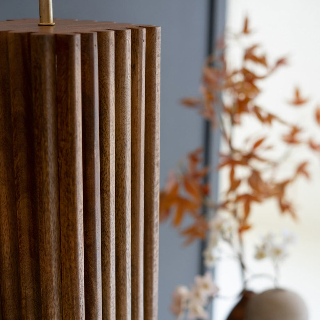 Highlight an undecorated corner with this floor lamp. Wooden spindles make the base, and it's topped with a fabric shade. A matching table lamp completes the set.