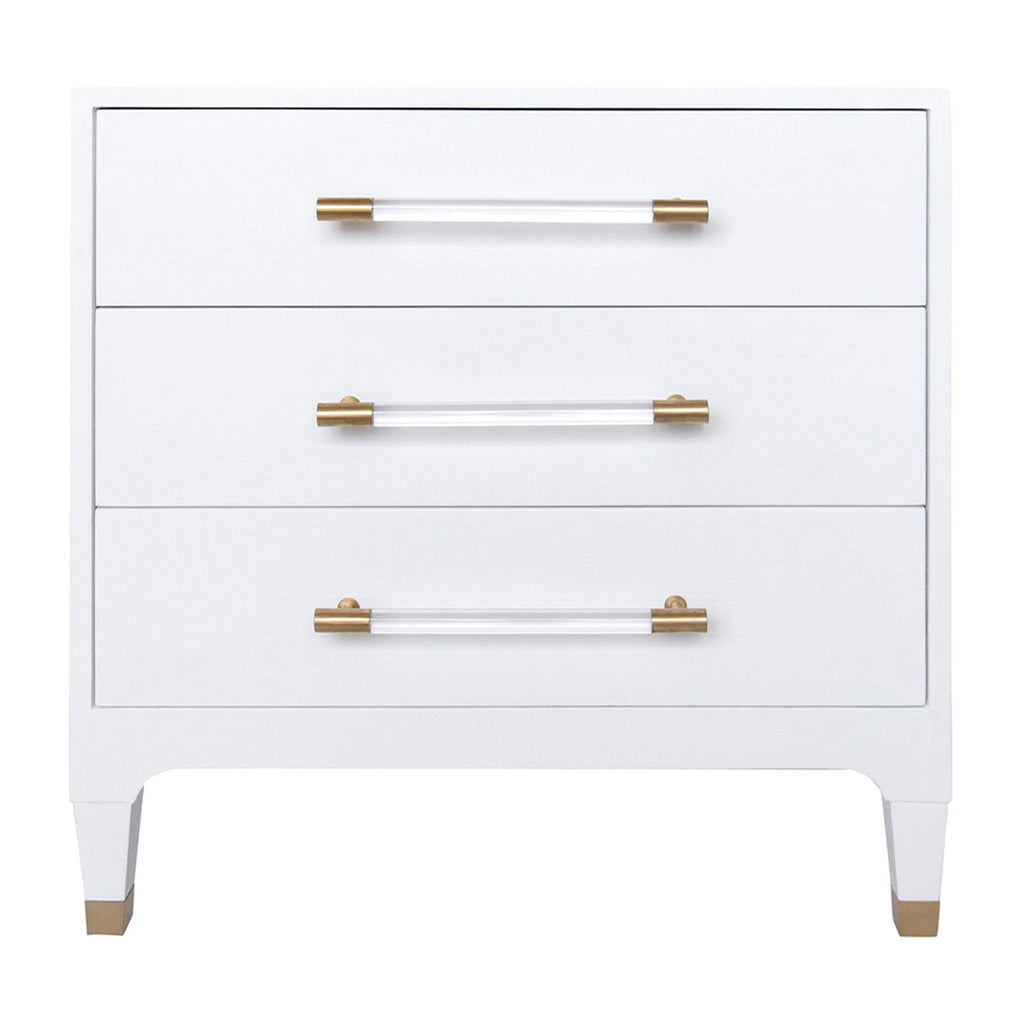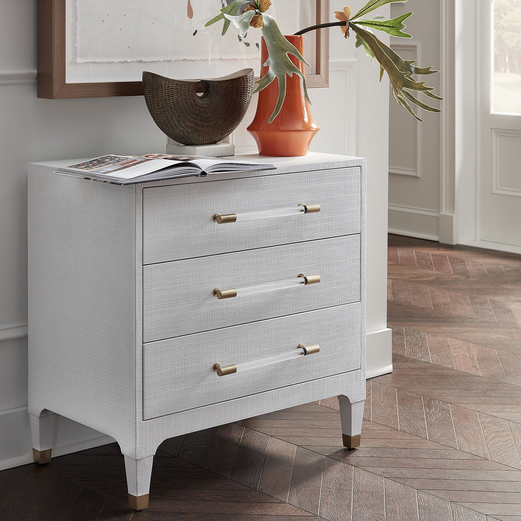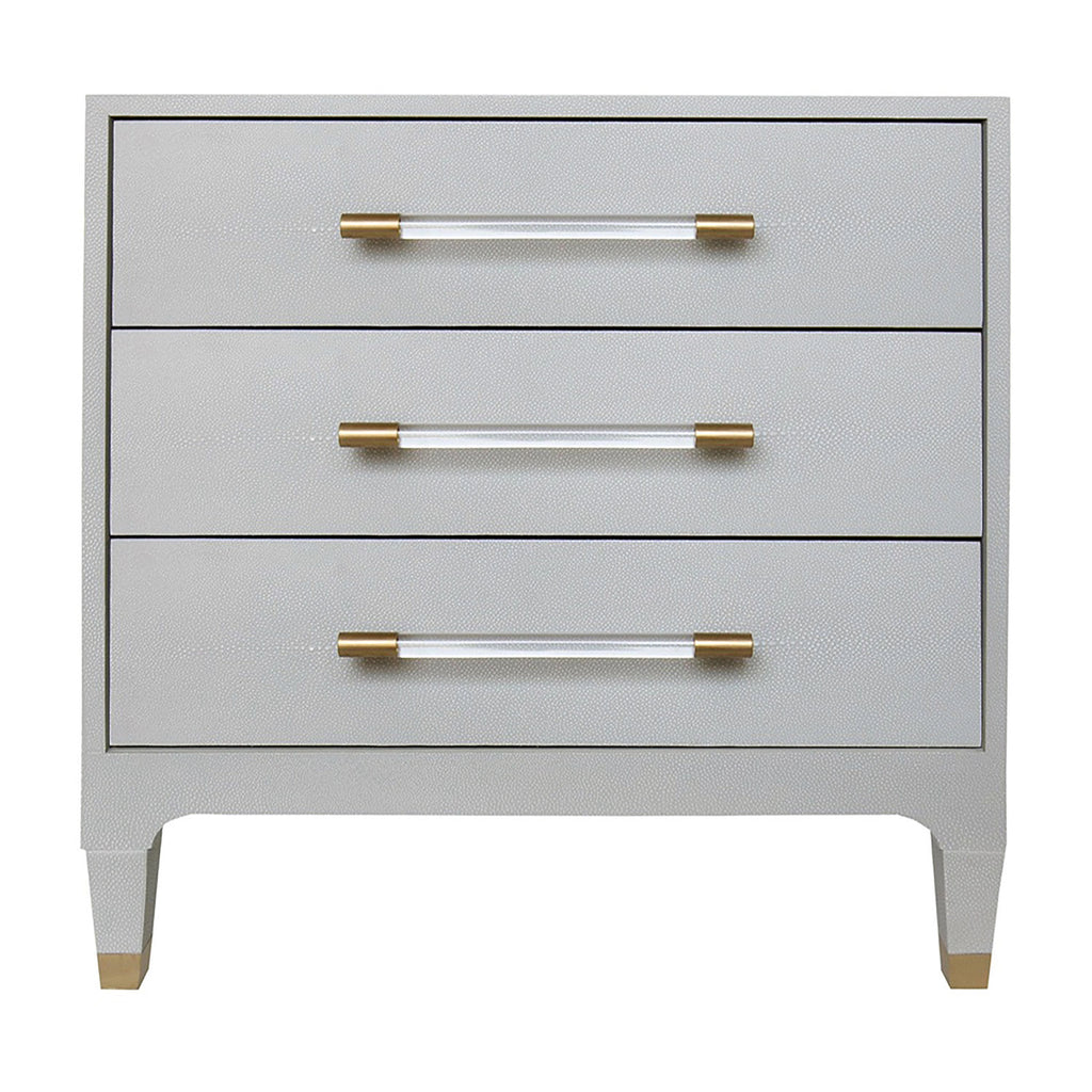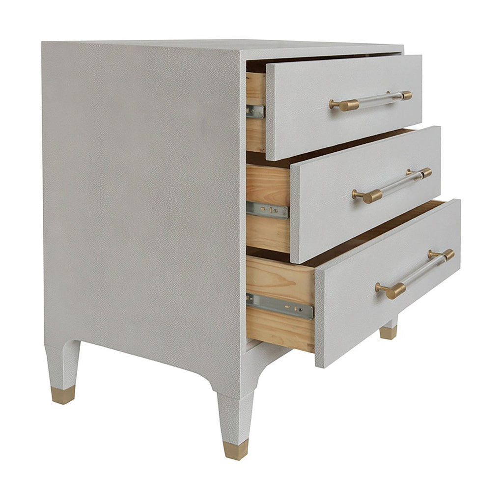 Worlds Away's contemporary glamor comes to life upon this gorgeous side table. Its eclectic textures complement a range of styles, making it the perfect addition to a bedroom or living room. Clean, elegant lines give this furnishing an elevated finish. Coco Chanel once said "simplicity is the keynote of all true elegance," and Worlds Away couldn't find a truer statement to describe the three drawer Maren side table. Dressed in textured white linen or luxurious dove grey shagreen and accented with acrylic and antique brass hardware pulls. Antique brass ferrule foot caps complete the elegant look.