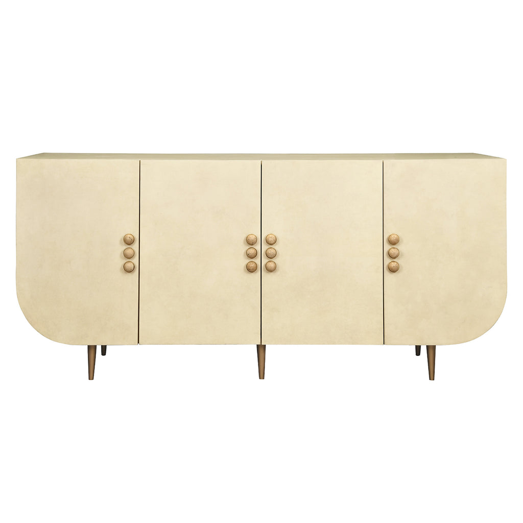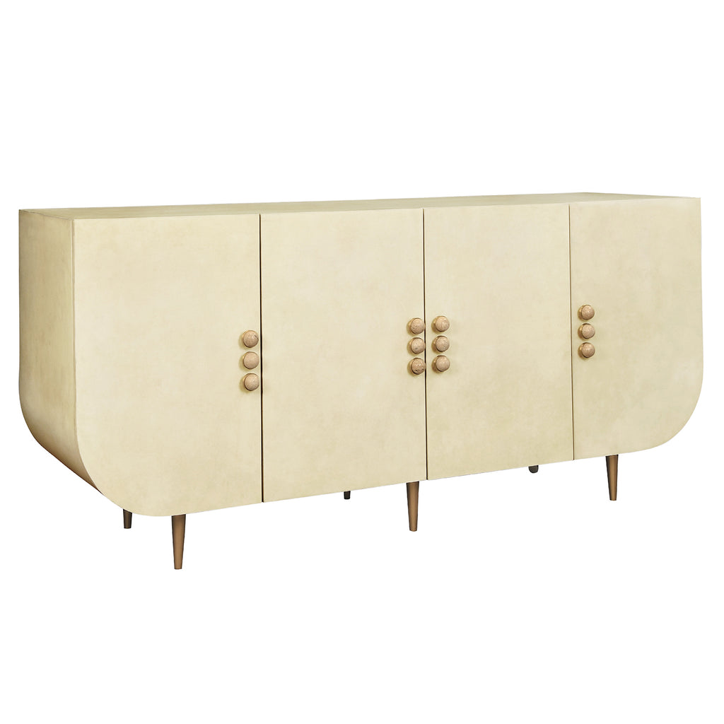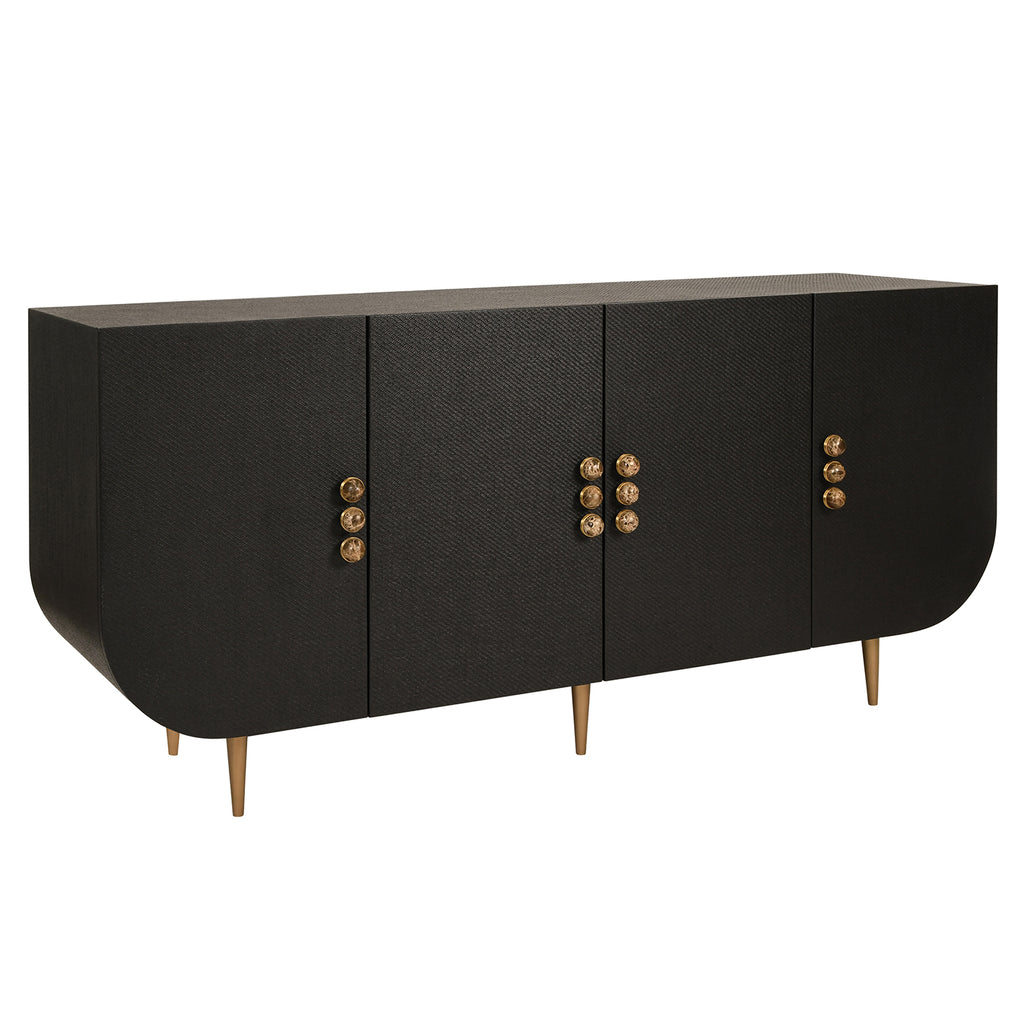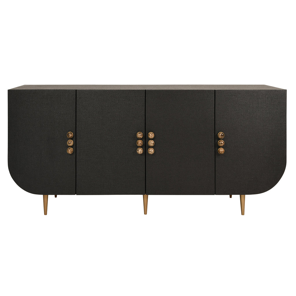 Four door buffet with curved bottom corners and natural stone hardware in black painted grasscloth