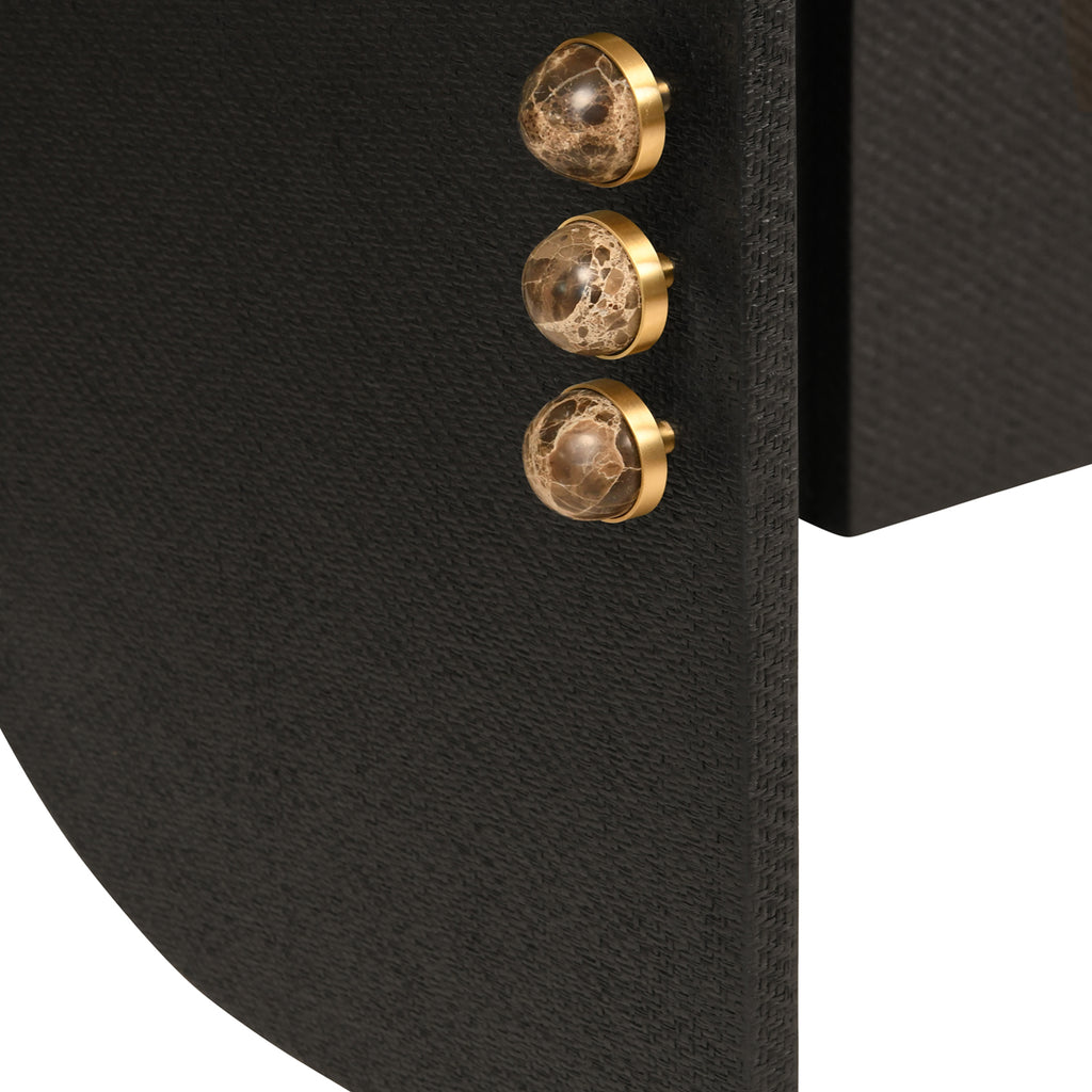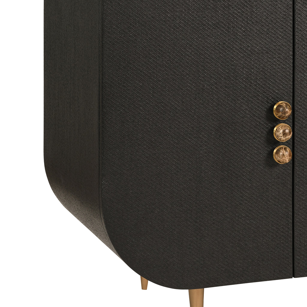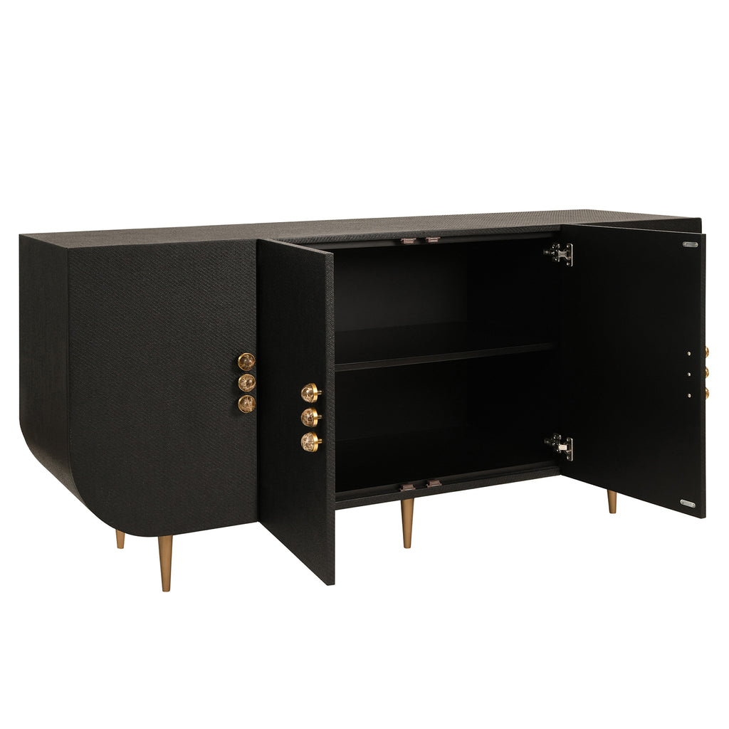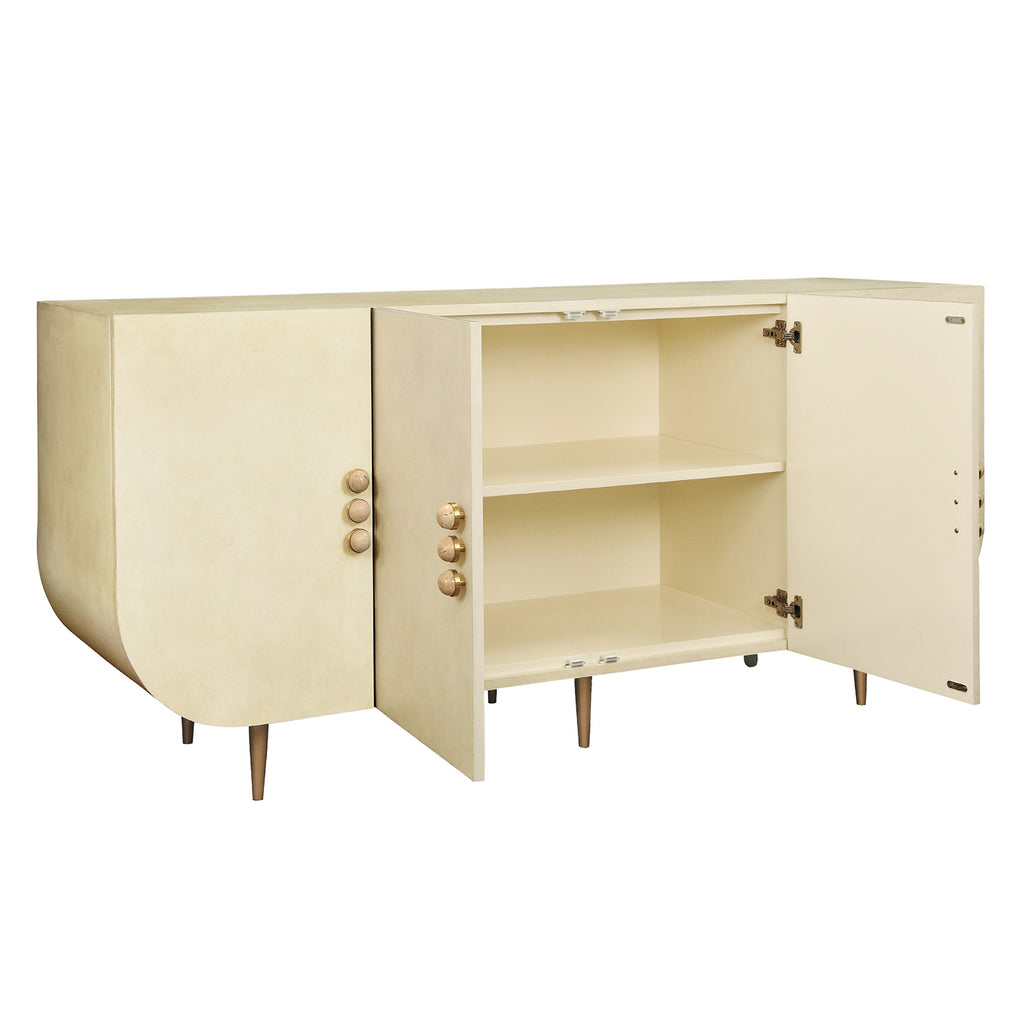Four door buffet with curved bottom corners and natural stone hardware in black painted grasscloth