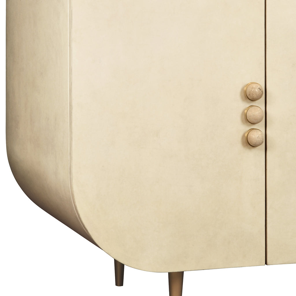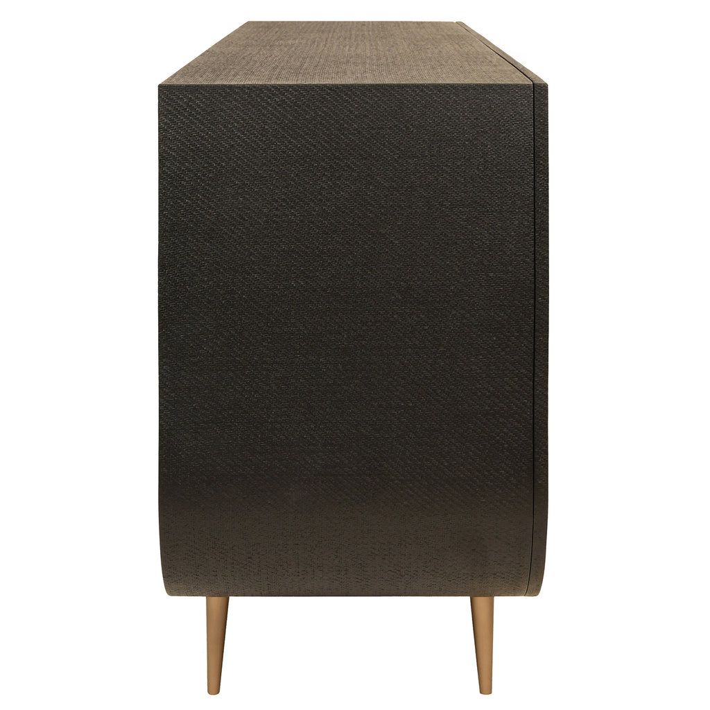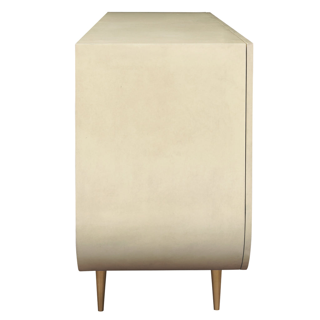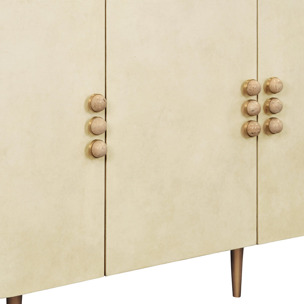 Four door buffet with curved bottom corners and natural stone hardware in black painted grasscloth