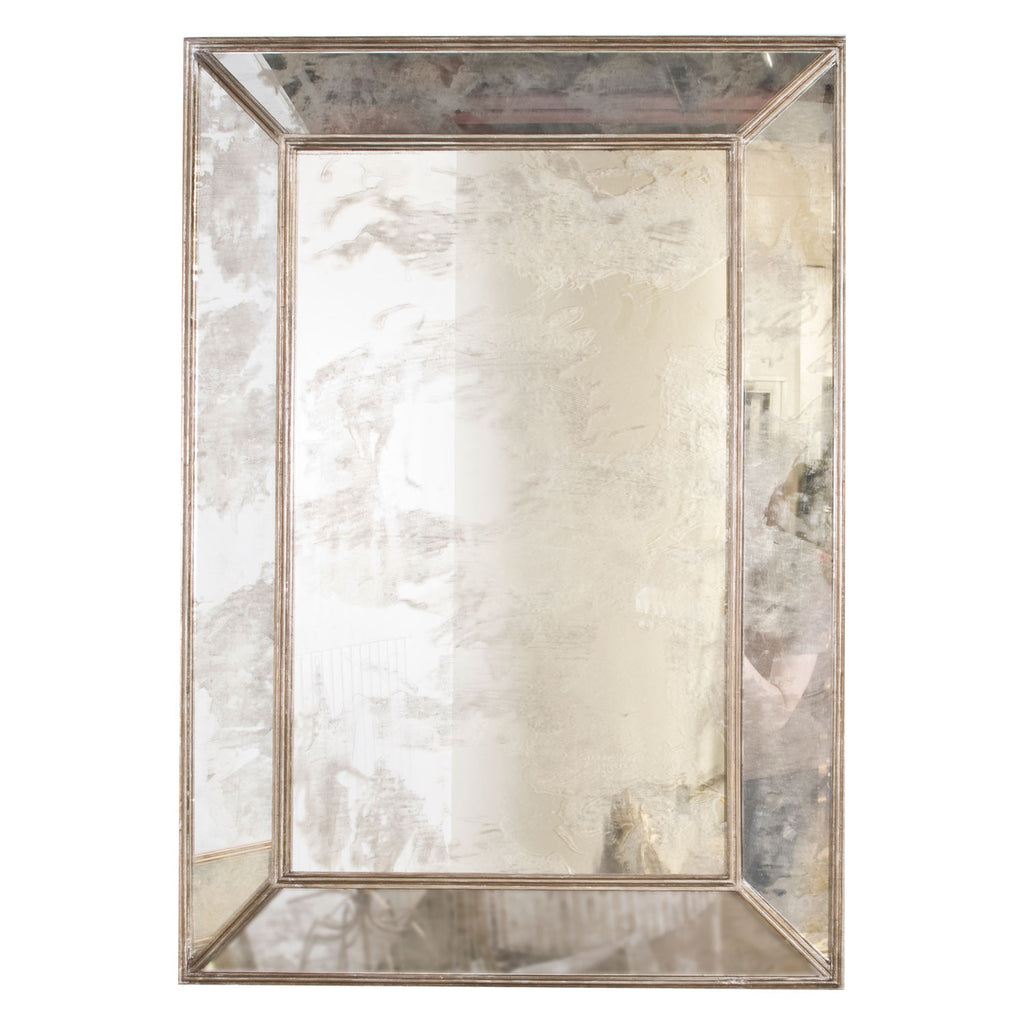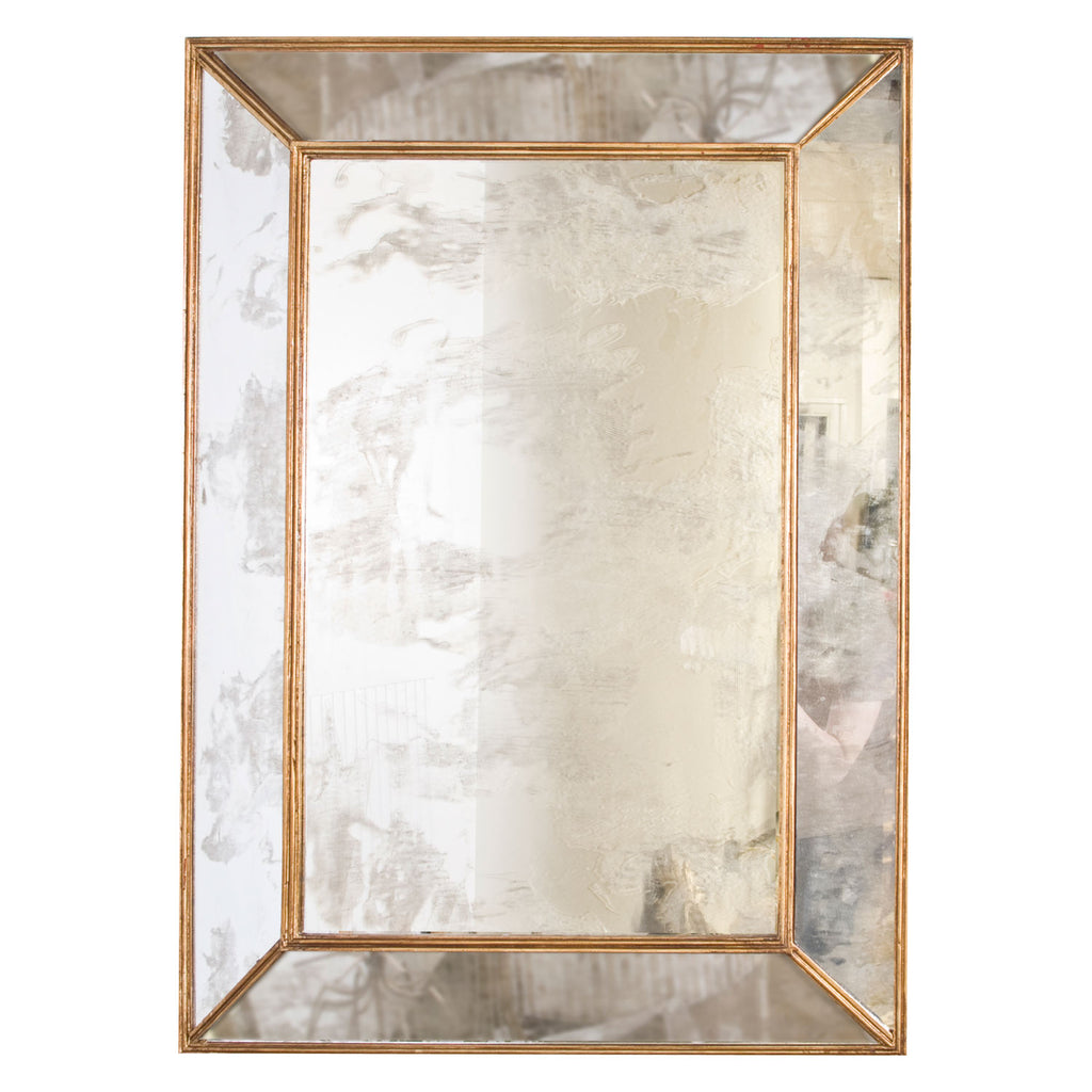 From Worlds Away, this wall mirror invites guests to peer into its design with contemporary allure. Hang this accent in a foyer, hallway or living room for a statement look. Rectangle antique mirror with gold leaf or silver leaf wood edging.