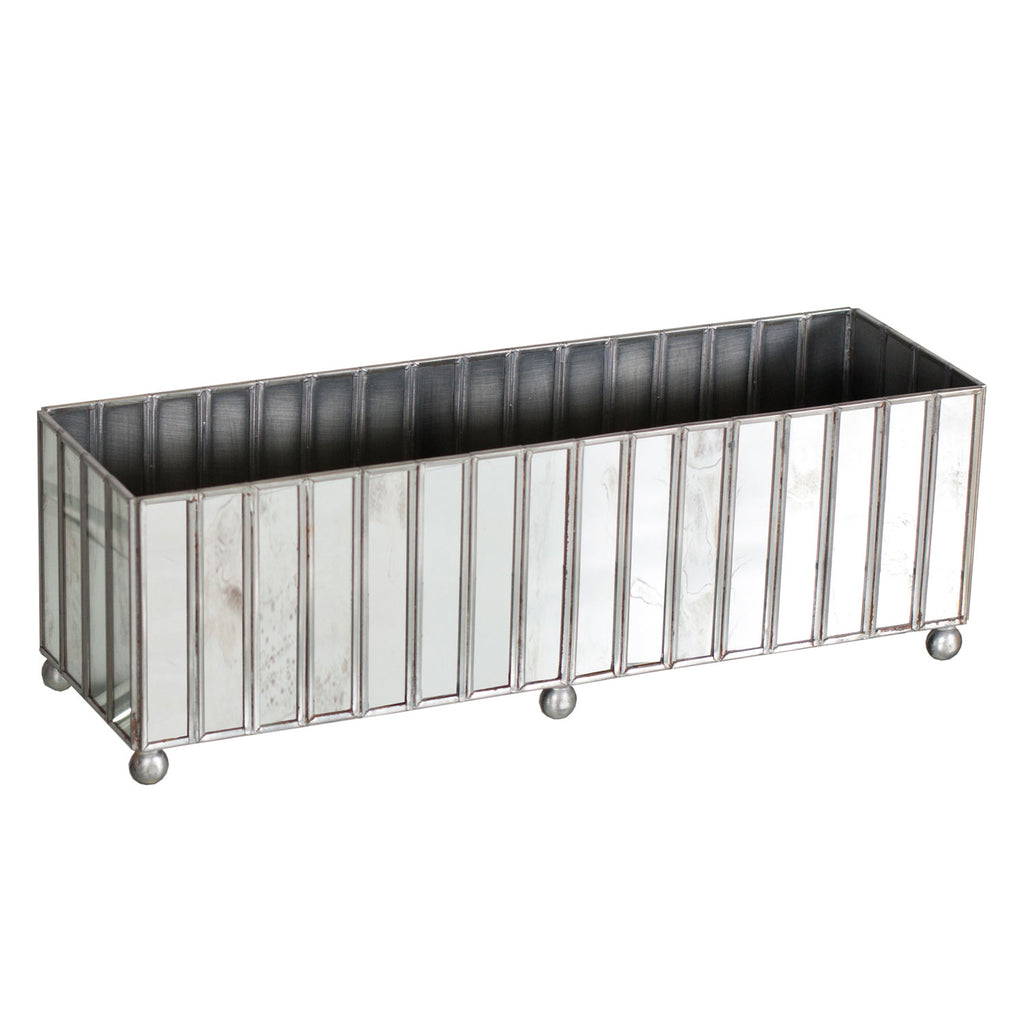 From Worlds Away, this gorgeous planter invites the eyes with bold, mirrored details. Plants and greenery make a striking contrast to this accessory's clean, modern vibe, offering a lovely accent to any space. Rectangle faceted antique mirror planter with silver edging.