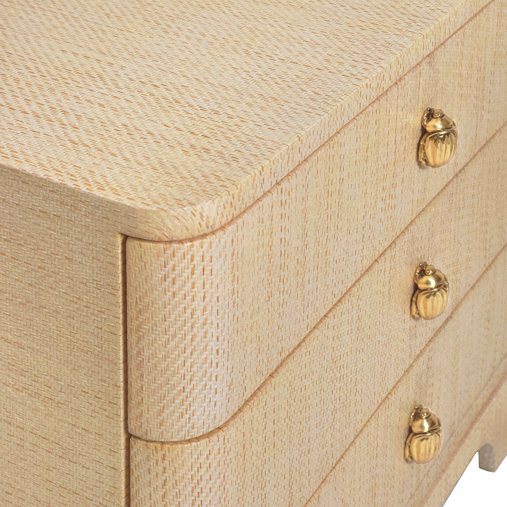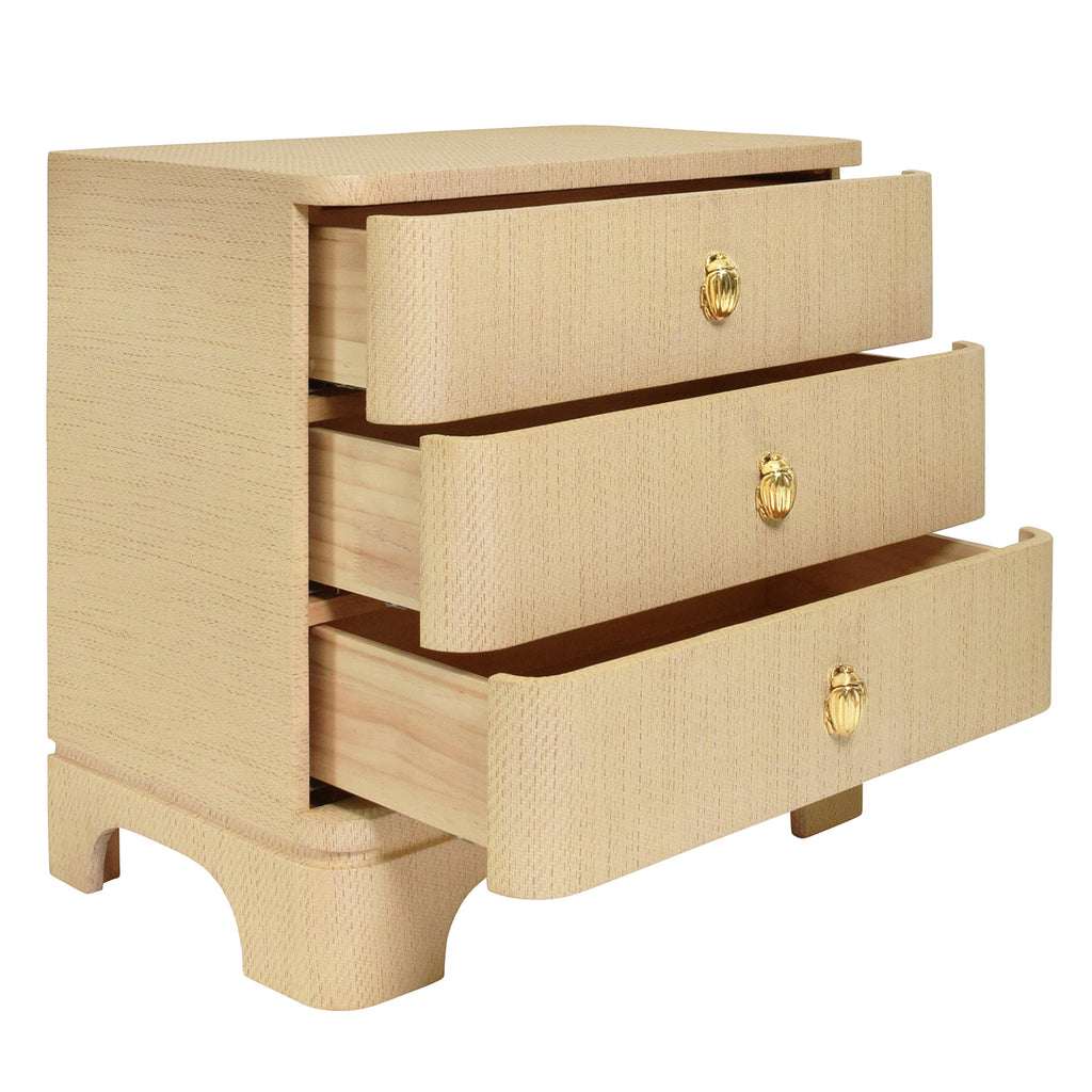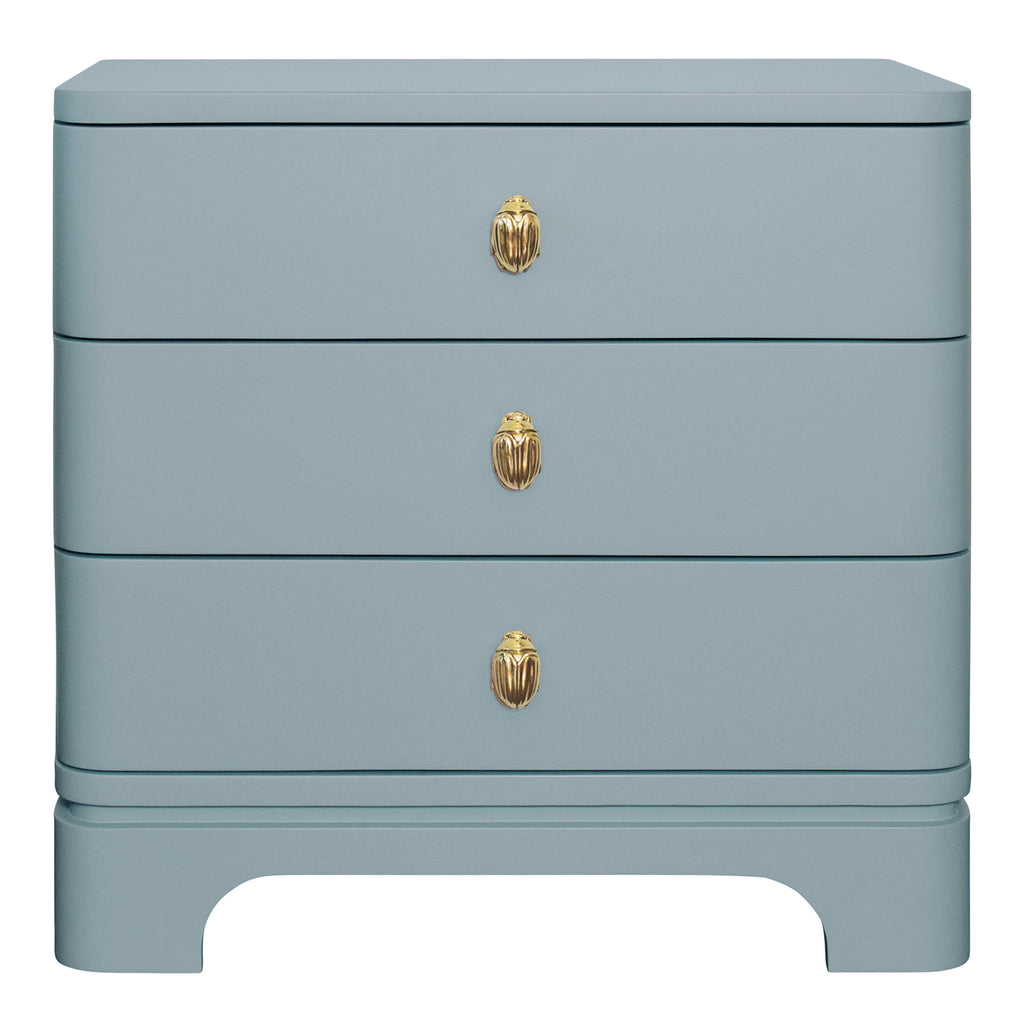 • Three drawer rounded edge side table with brass beetle knob in light blue matte lacquer