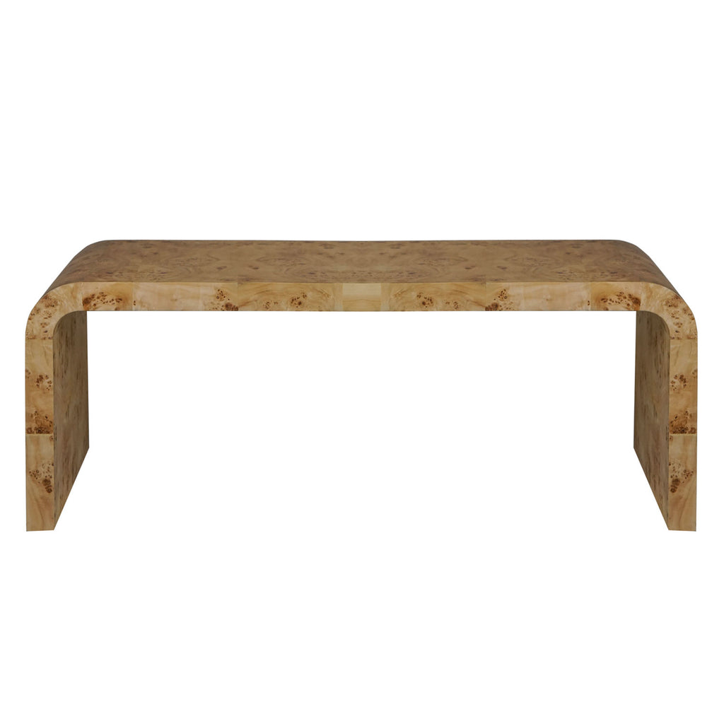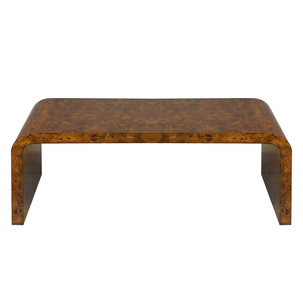 From Worlds Away, this coffee table offers a dazzling presence to a living room. Sleek and elegant, this chic furnishing expresses bold modernity with geometric style. Its minimalist silhouette makes it a transitional piece for your space.  Burl wood has natural variations and may differ slightly between panels.Dark burlwood or light burlwood waterfall coffee table.