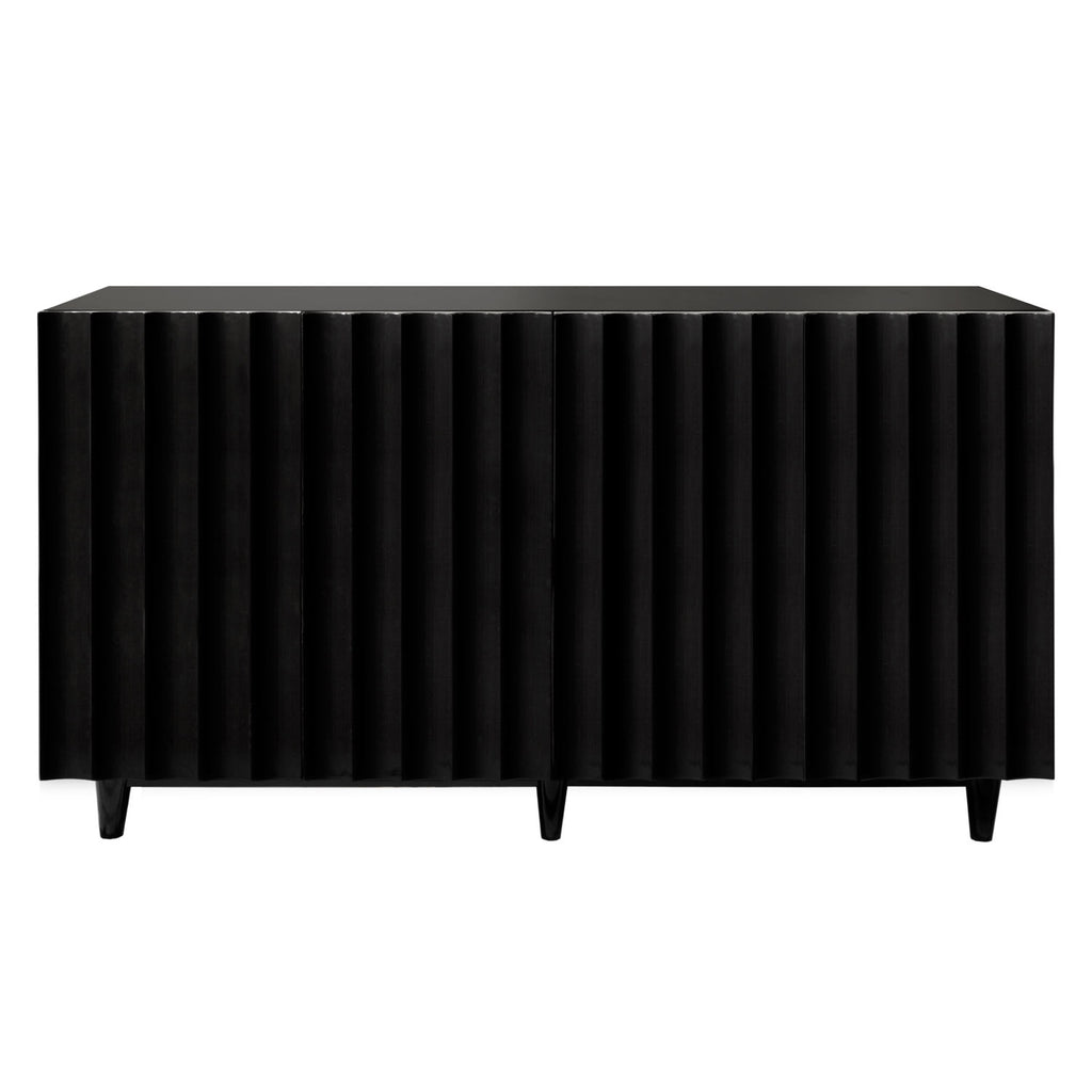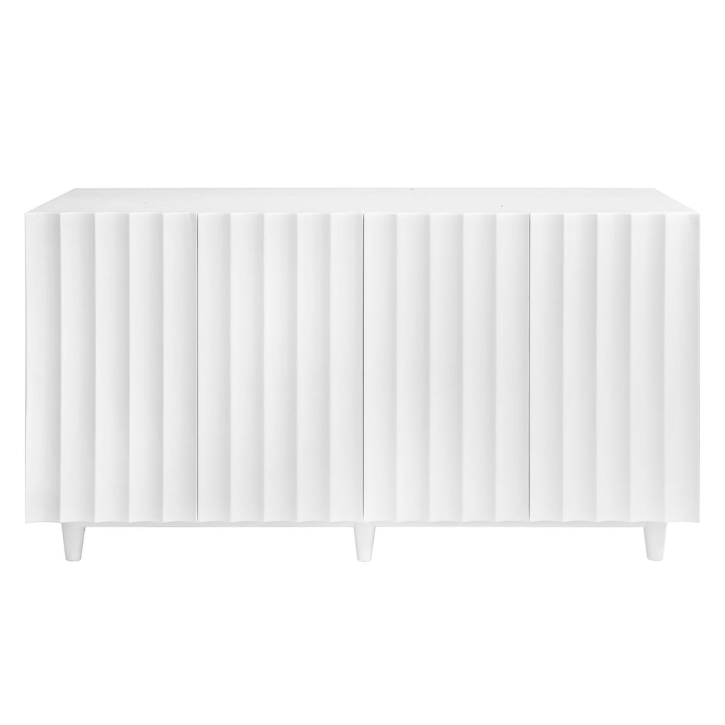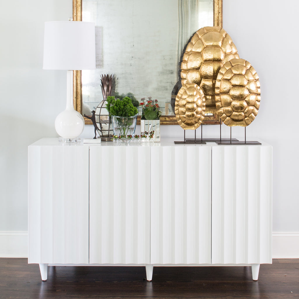 Invite a statement furnishing into your home with this buffet from Worlds Away. A mix of function and contemporary glamor, this furnishing invites attention with its elegant textured details. Cabinets offer ample storage space for dining ware and accessories. Black lacquer or white lacquer four door scalloped front cabinet.