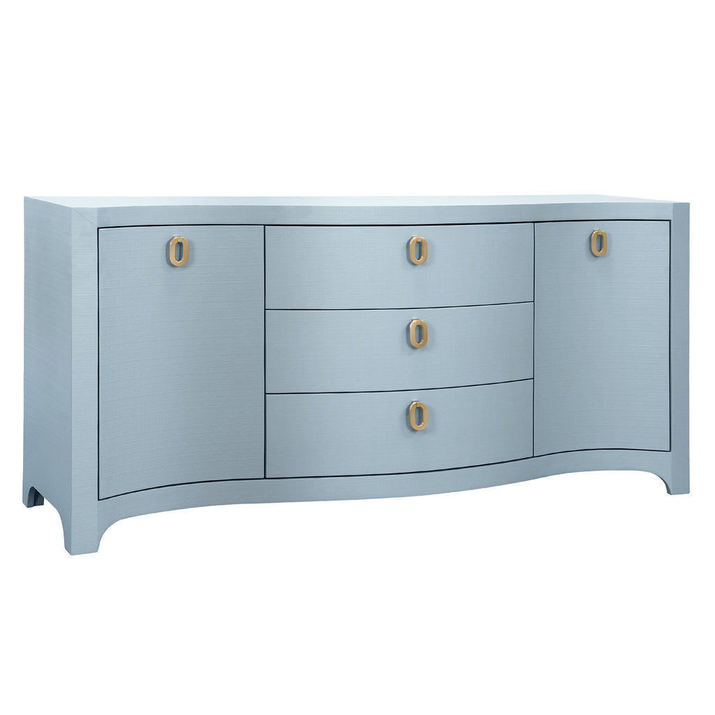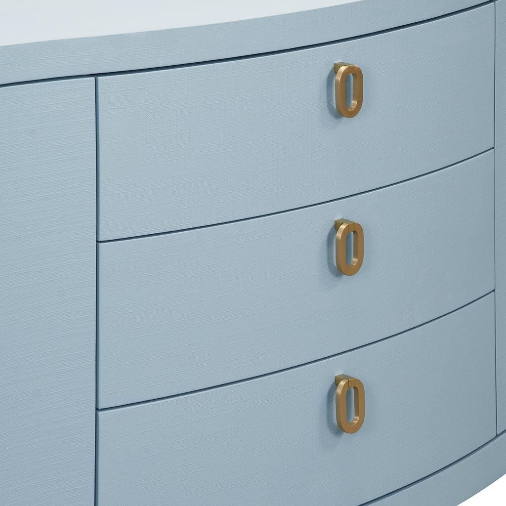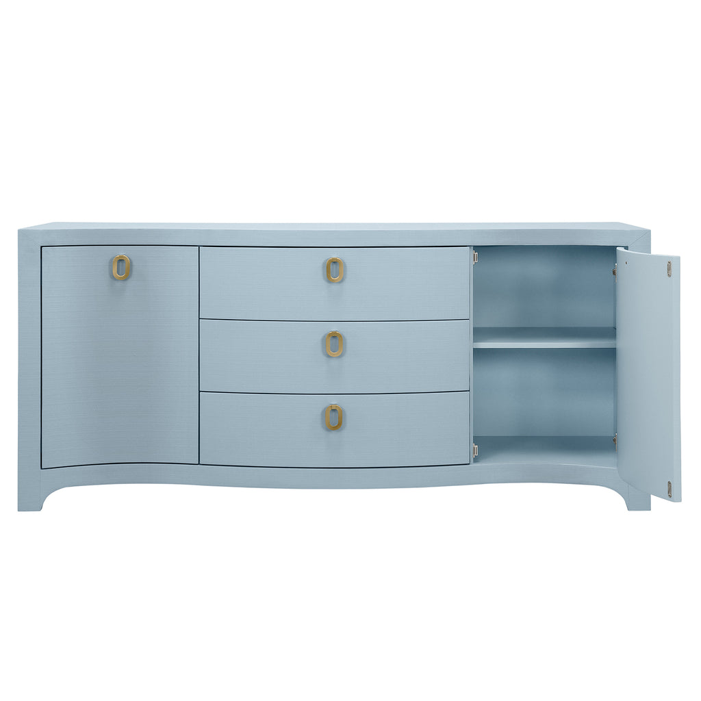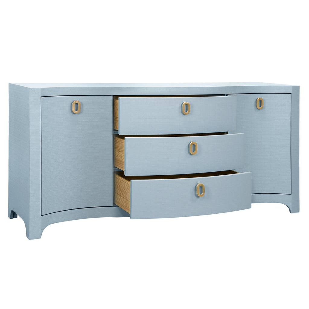 Elegant and sculptural, the Paulina LB curved-front buffet brings refined texture and graceful form to any dining or living space. Paulina is gracefully wrapped in textured light blue linen, softened by its gently bowed silhouette and elevated by the subtle sheen of satin brass ring pulls. Two doors and three drawers offer versatile storage, seamlessly blending function with high-end design. With its crisp palette and tailored detailing, this buffet makes a sophisticated statement while maintaining an air of relaxed elegance.