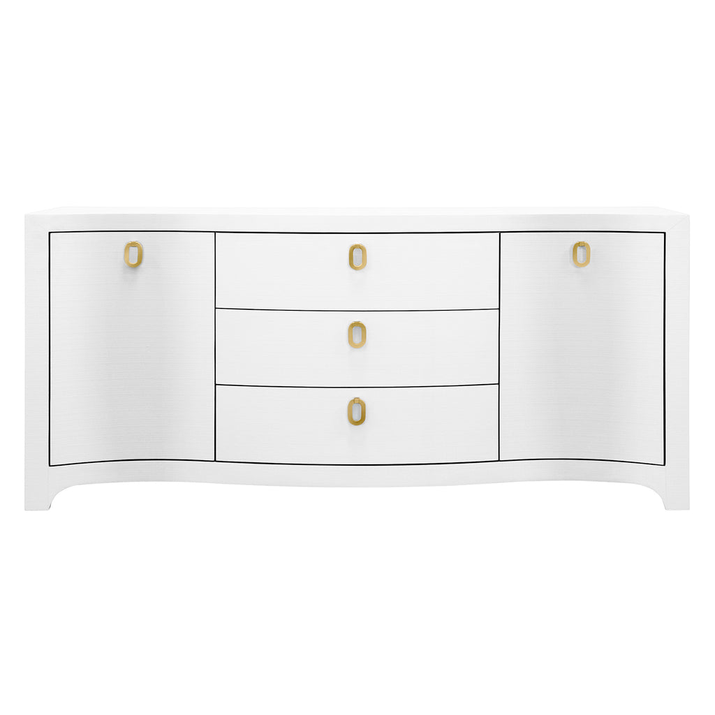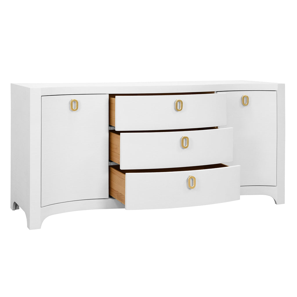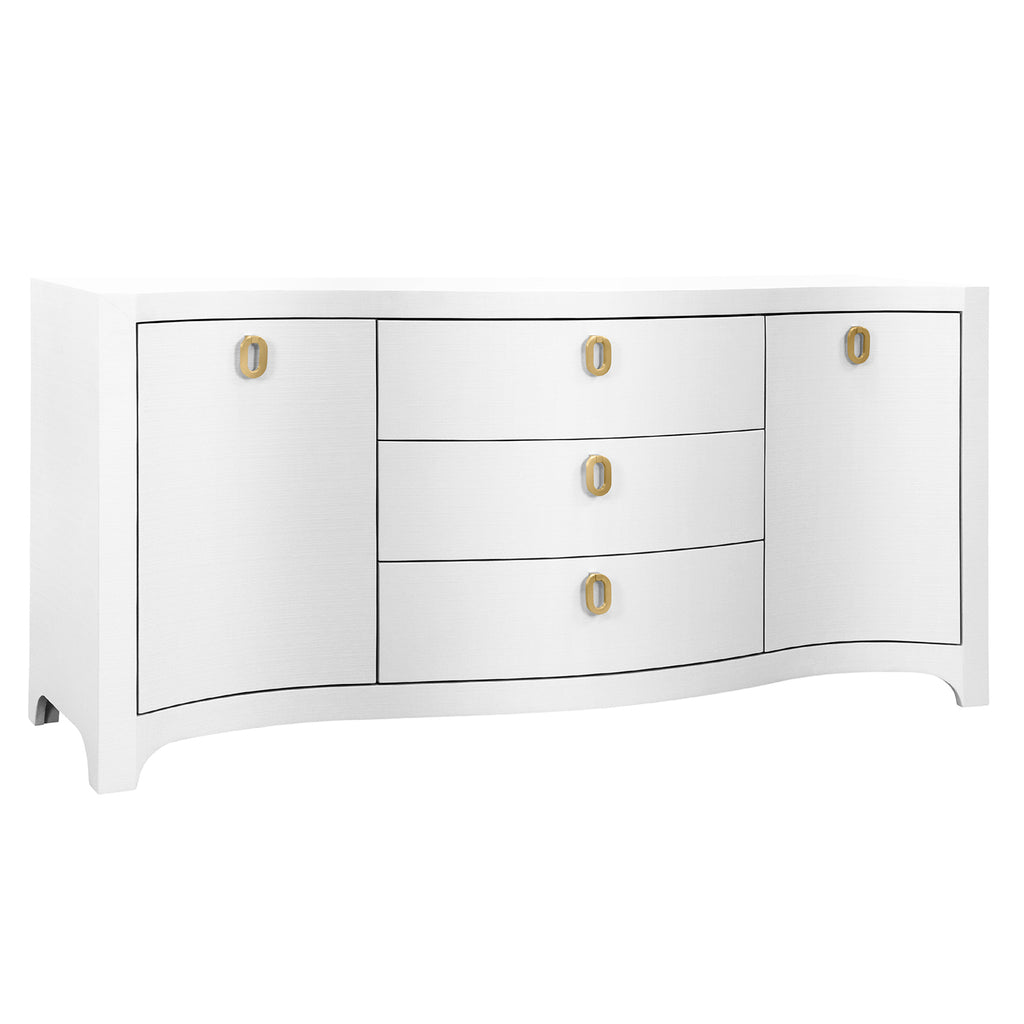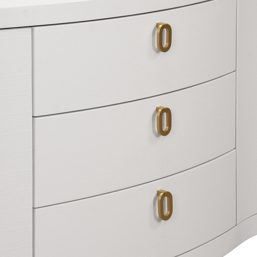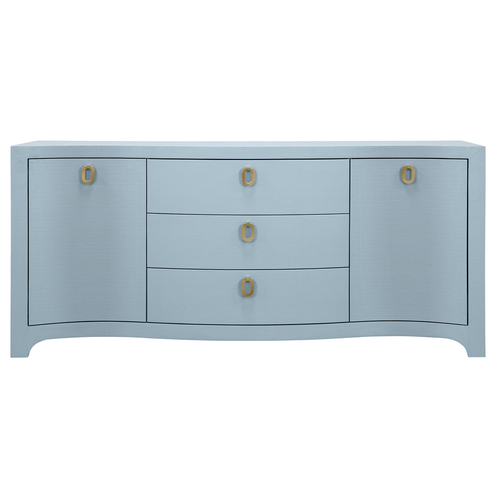 Elegant and sculptural, the Paulina LB curved-front buffet brings refined texture and graceful form to any dining or living space. Paulina is gracefully wrapped in textured light blue linen, softened by its gently bowed silhouette and elevated by the subtle sheen of satin brass ring pulls. Two doors and three drawers offer versatile storage, seamlessly blending function with high-end design. With its crisp palette and tailored detailing, this buffet makes a sophisticated statement while maintaining an air of relaxed elegance.