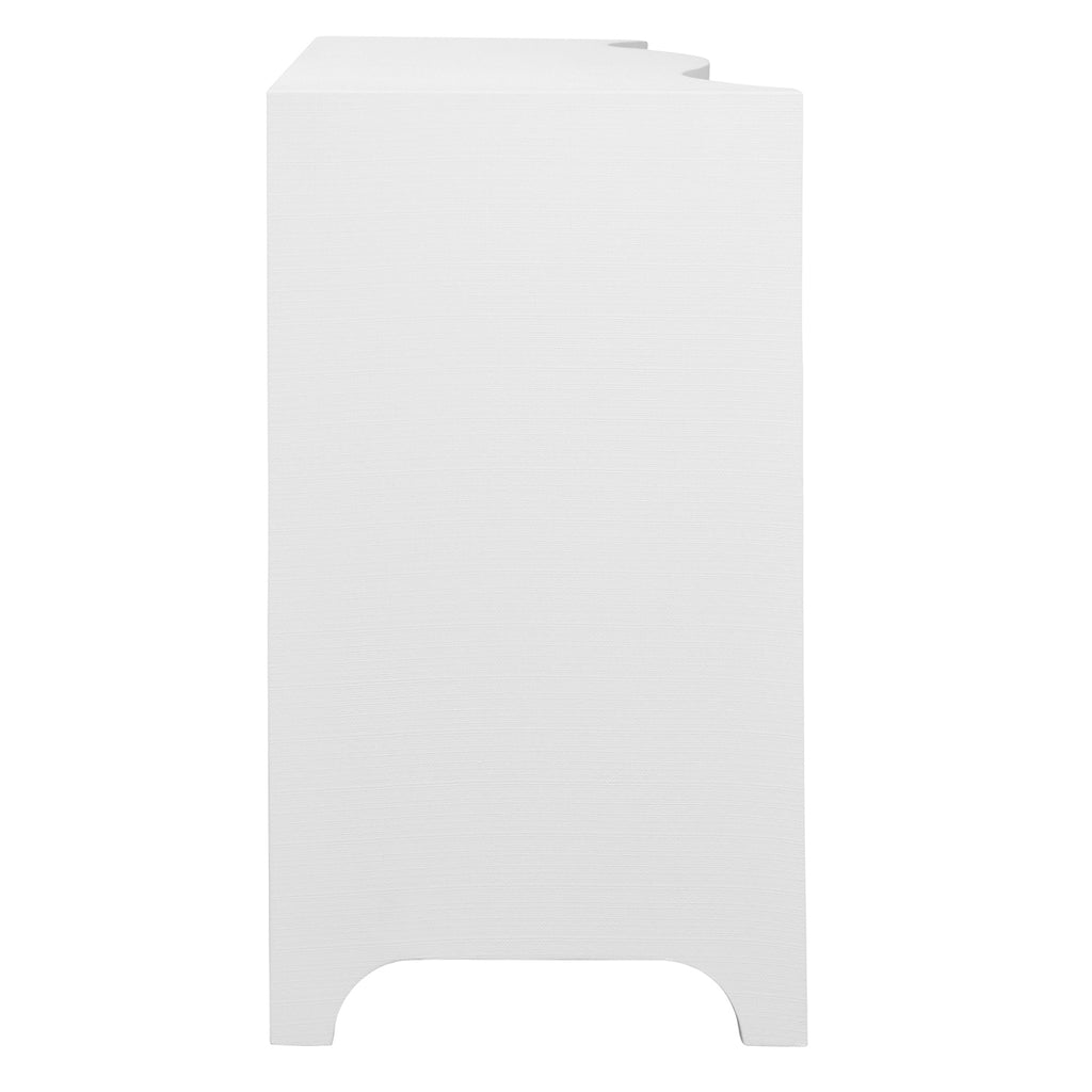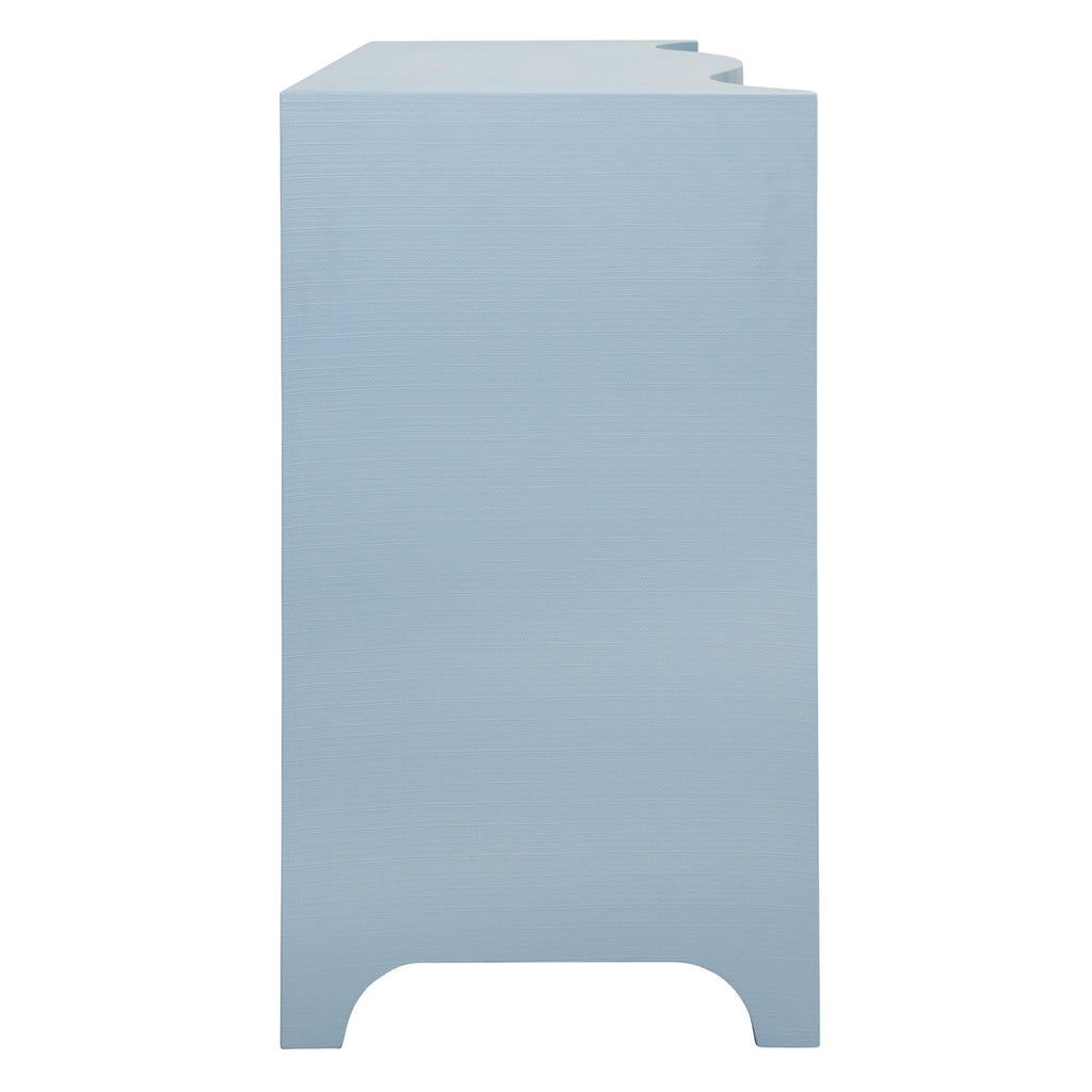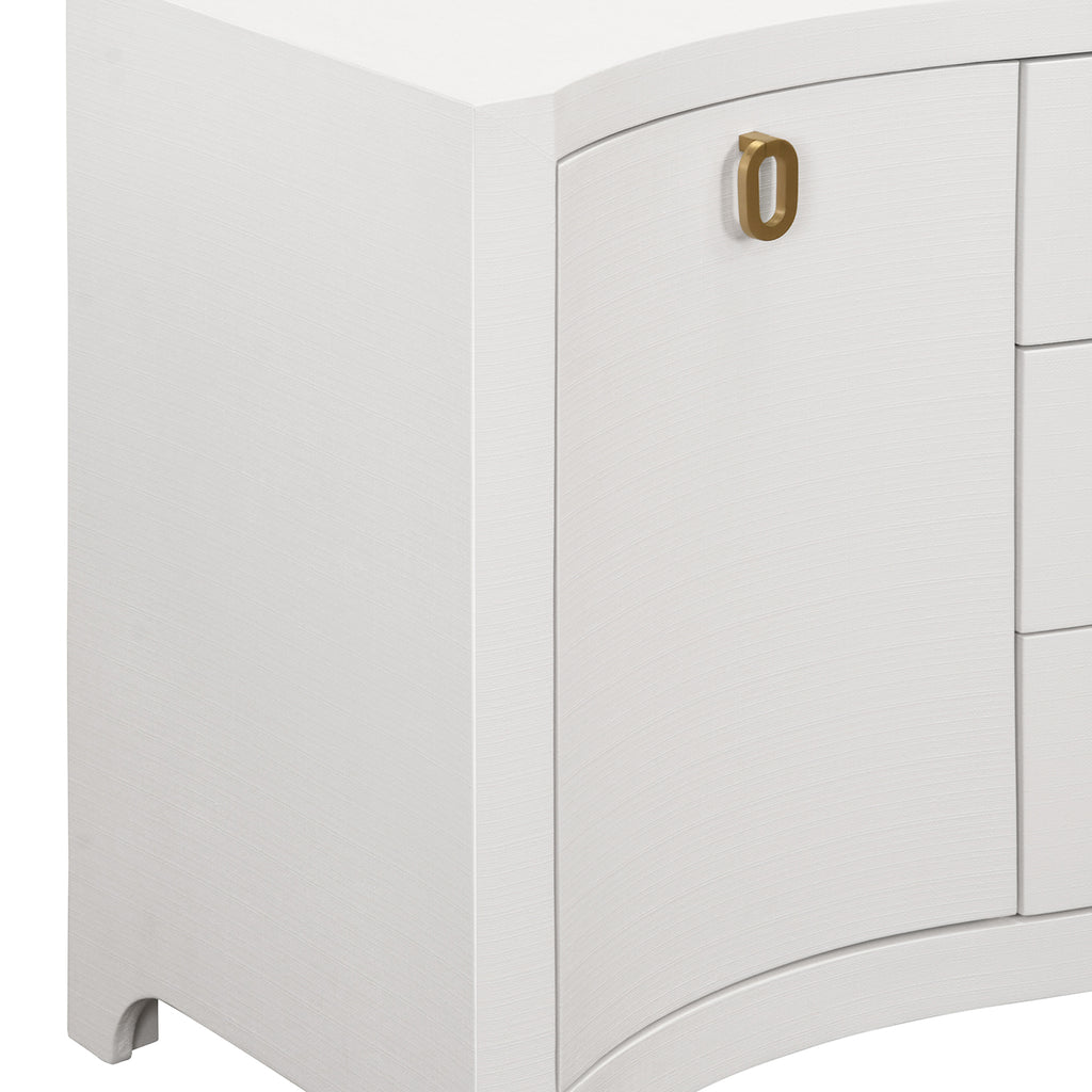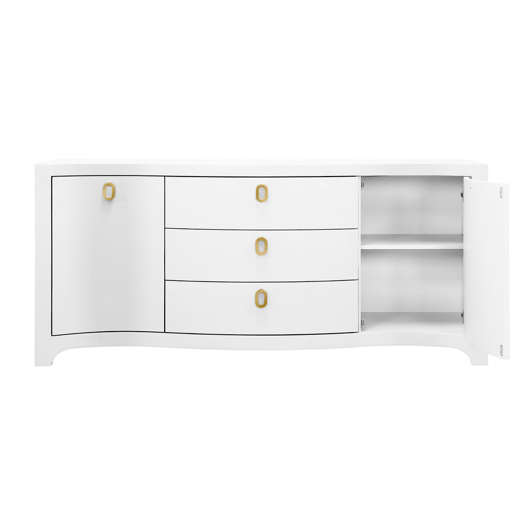 Elegant and sculptural, the Paulina LB curved-front buffet brings refined texture and graceful form to any dining or living space. Paulina is gracefully wrapped in textured light blue linen, softened by its gently bowed silhouette and elevated by the subtle sheen of satin brass ring pulls. Two doors and three drawers offer versatile storage, seamlessly blending function with high-end design. With its crisp palette and tailored detailing, this buffet makes a sophisticated statement while maintaining an air of relaxed elegance.