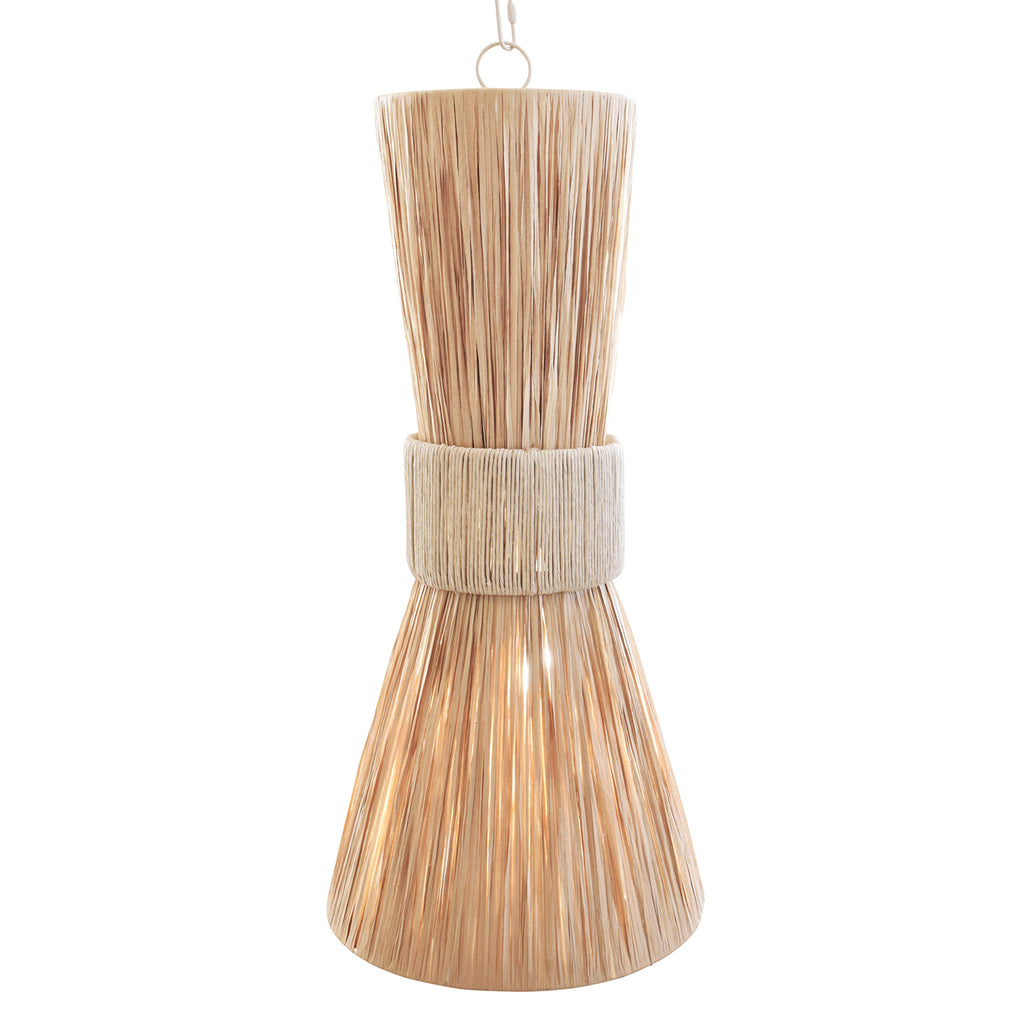 • Elongated hourglass pendant wrapped in natural rafia