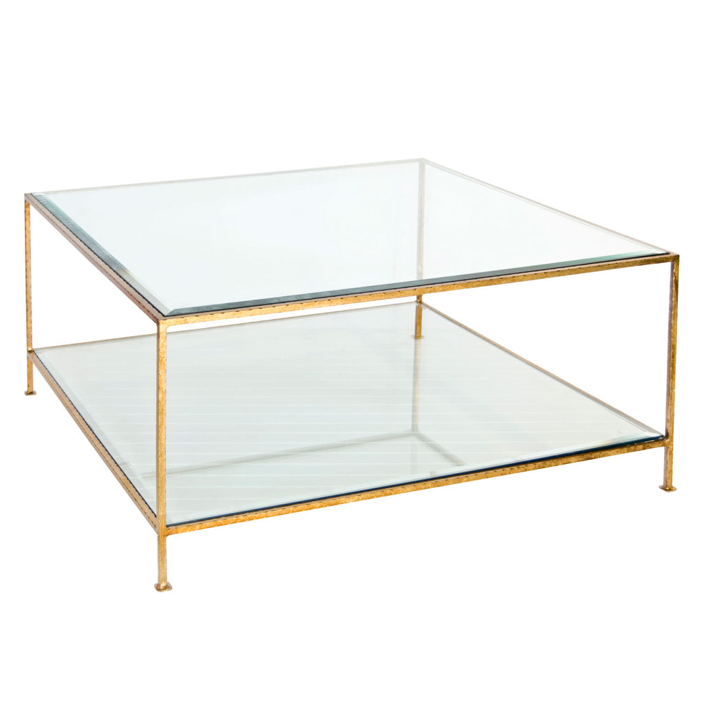 From Worlds Away, this coffee table offers a dazzling presence to a living room. Sleek and elegant, this chic furnishing expresses bold modernity with geometric style. Its minimalist silhouette makes it a transitional piece for your space. Hammered gold leaf square coffee table with beveled glass top.