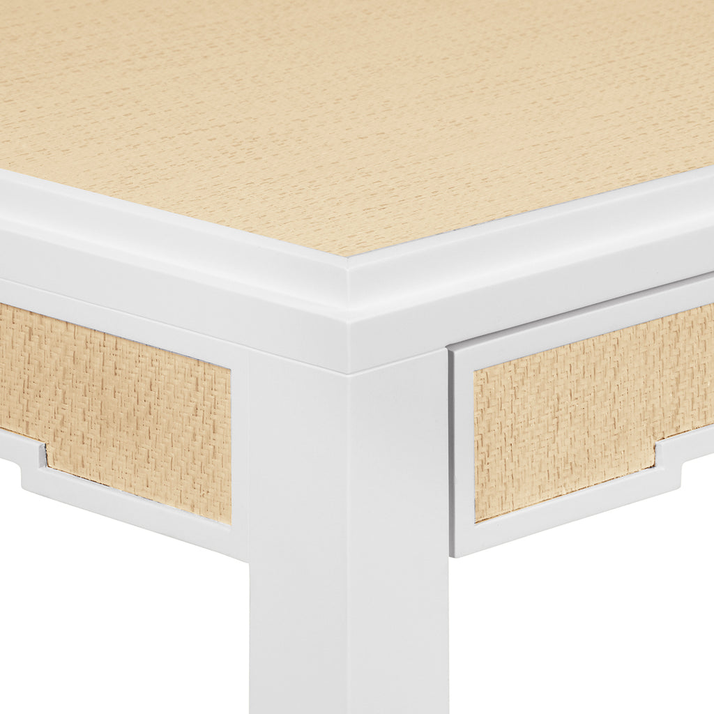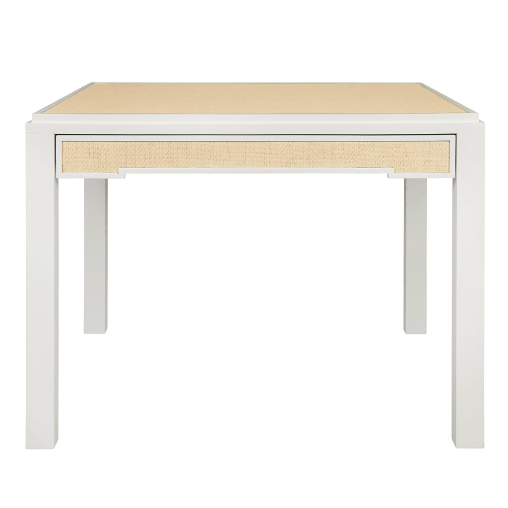 Square two drawer game table in matte white lacquer frame and inset natural grasscloth