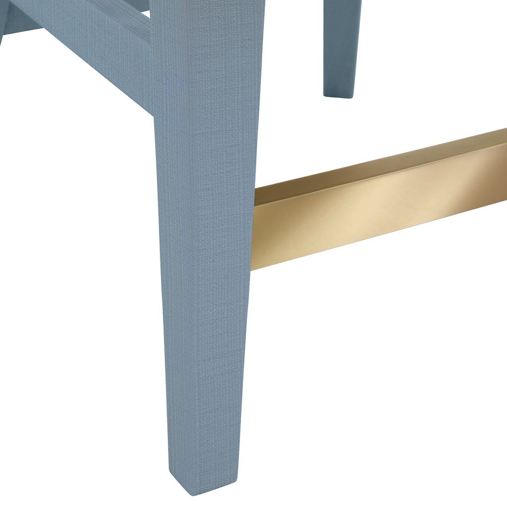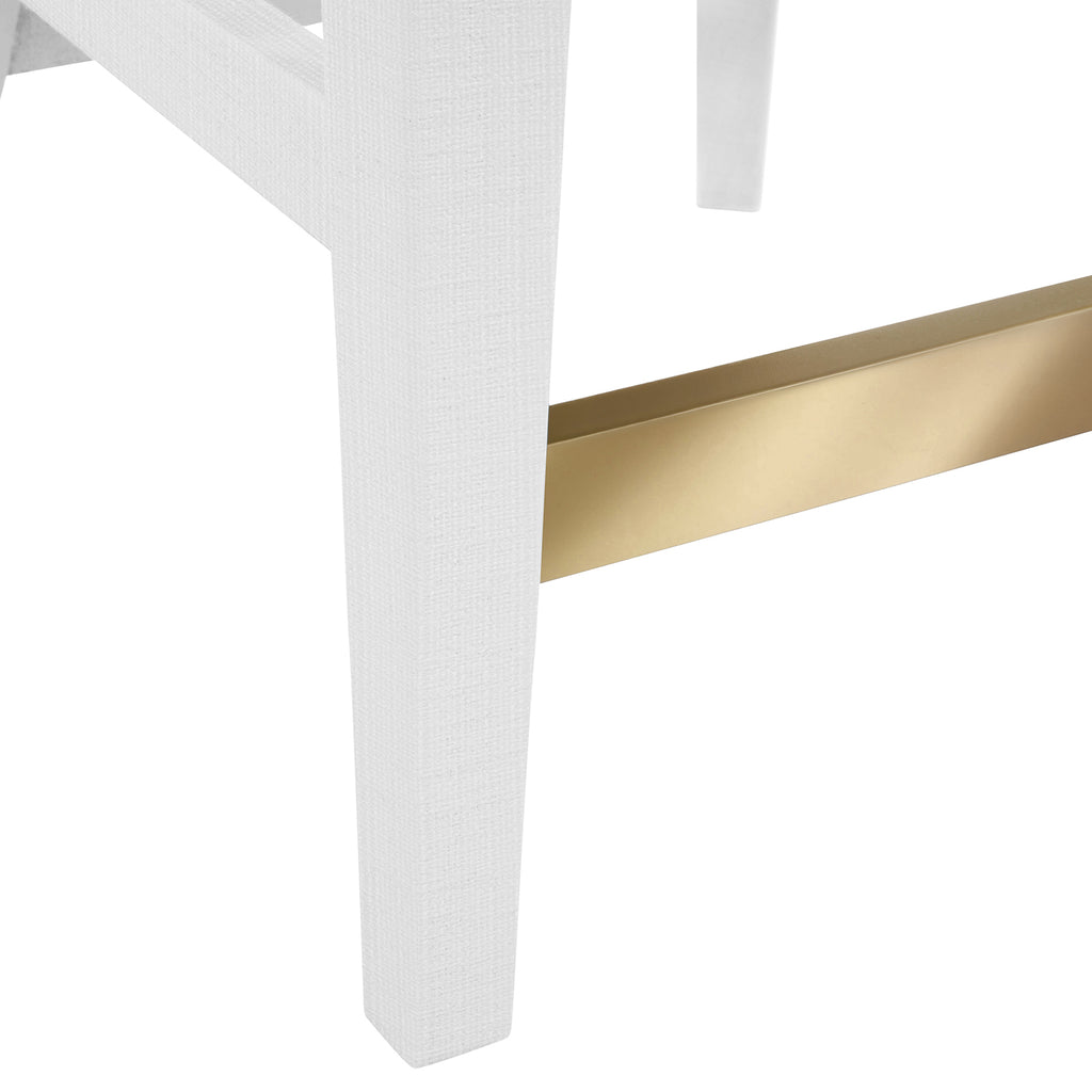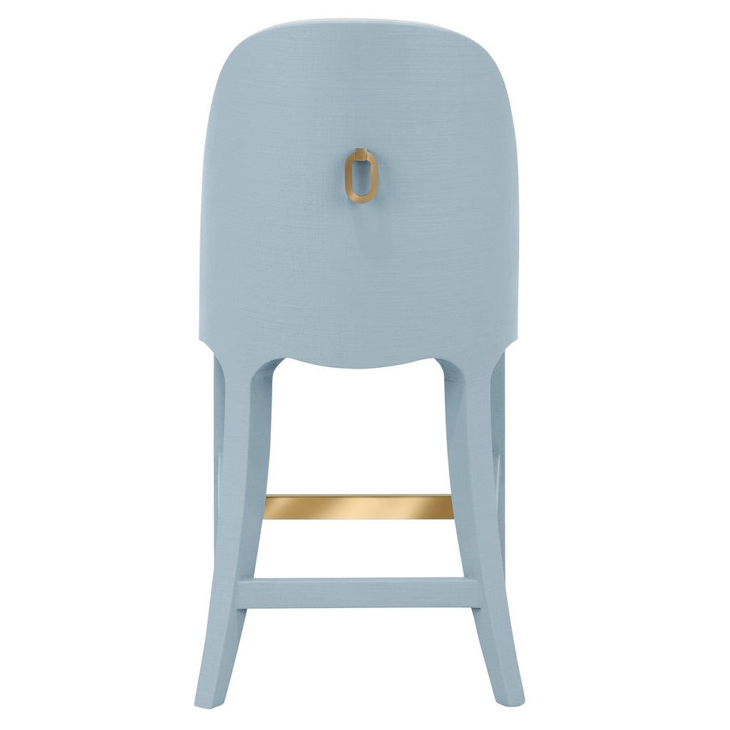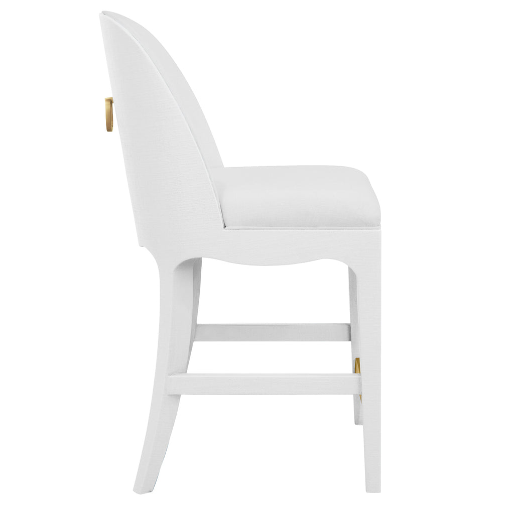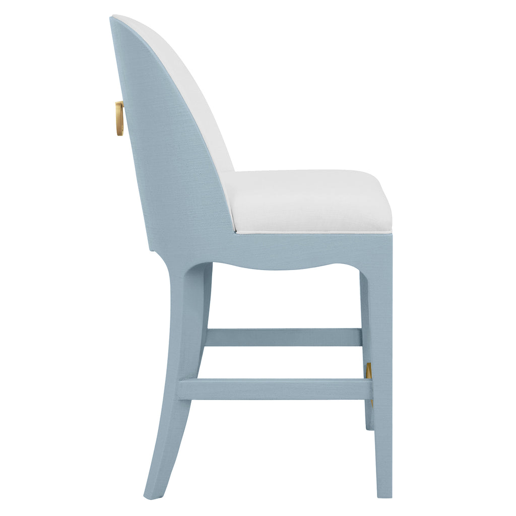 Graceful curves and soft textures define the elegant Sadie CS LB stool, where comfort meets quiet sophistication. Upholstered in performance white linen, its clean counter height seat is framed in textured light blue linen for a subtle hint of color. A satin brass ring on the back adds a touch of glamour, catching the light with every turn. Perfectly poised for kitchen islands or casual gatherings, it brings a refined presence to every seat at the counter.
