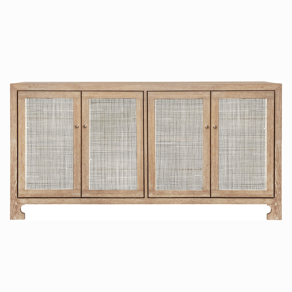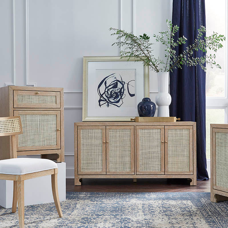 British West Indies style with a modern flair, this chic cabinet showcases natural, hand-woven caning on a stunning, natural cerused oak canvas. The result – a sublime composition that embodies casual elegance. Includes adjustable shelves in each cabinet. Whether placed in a coastal retreat or downtown loft, Sofia complements any design motif.