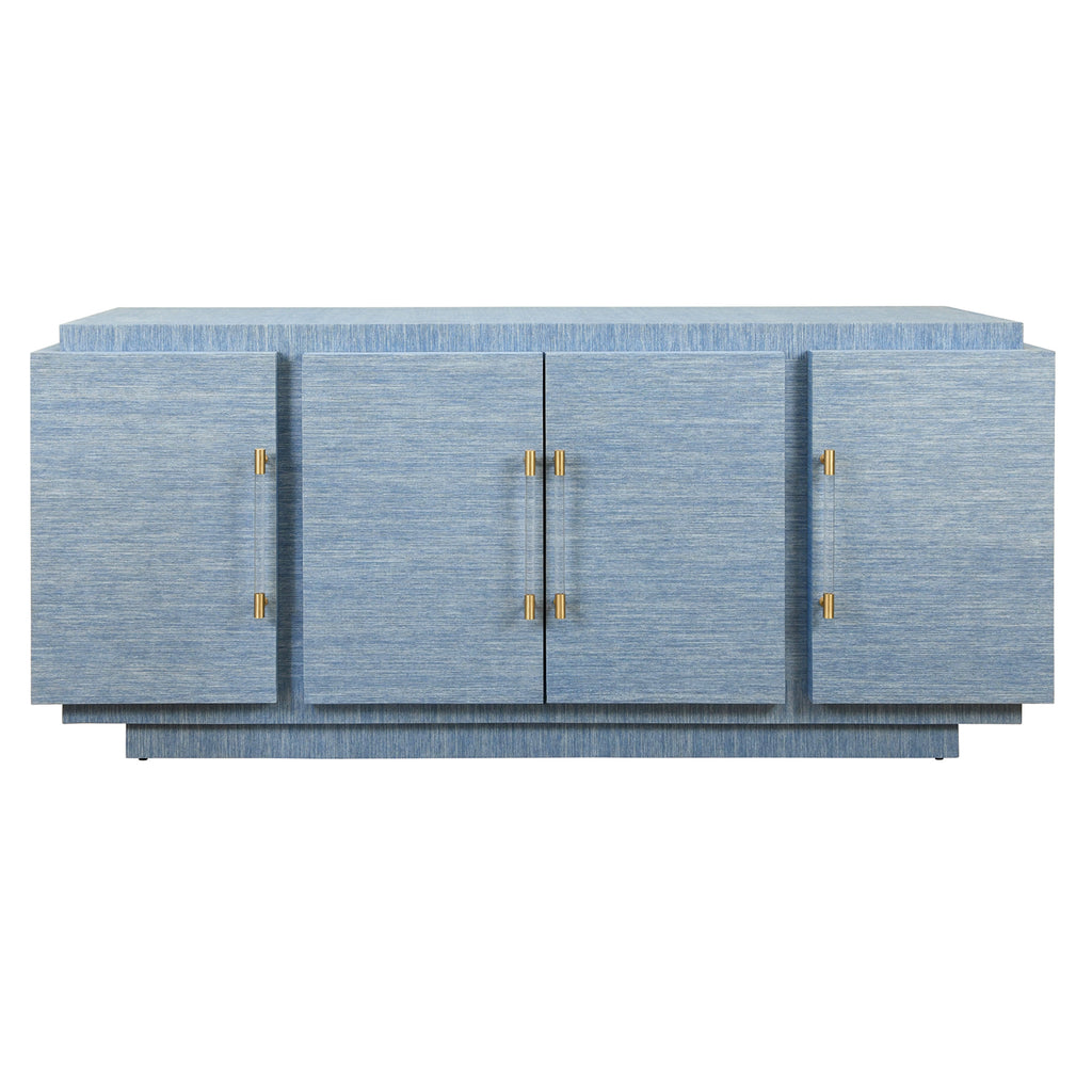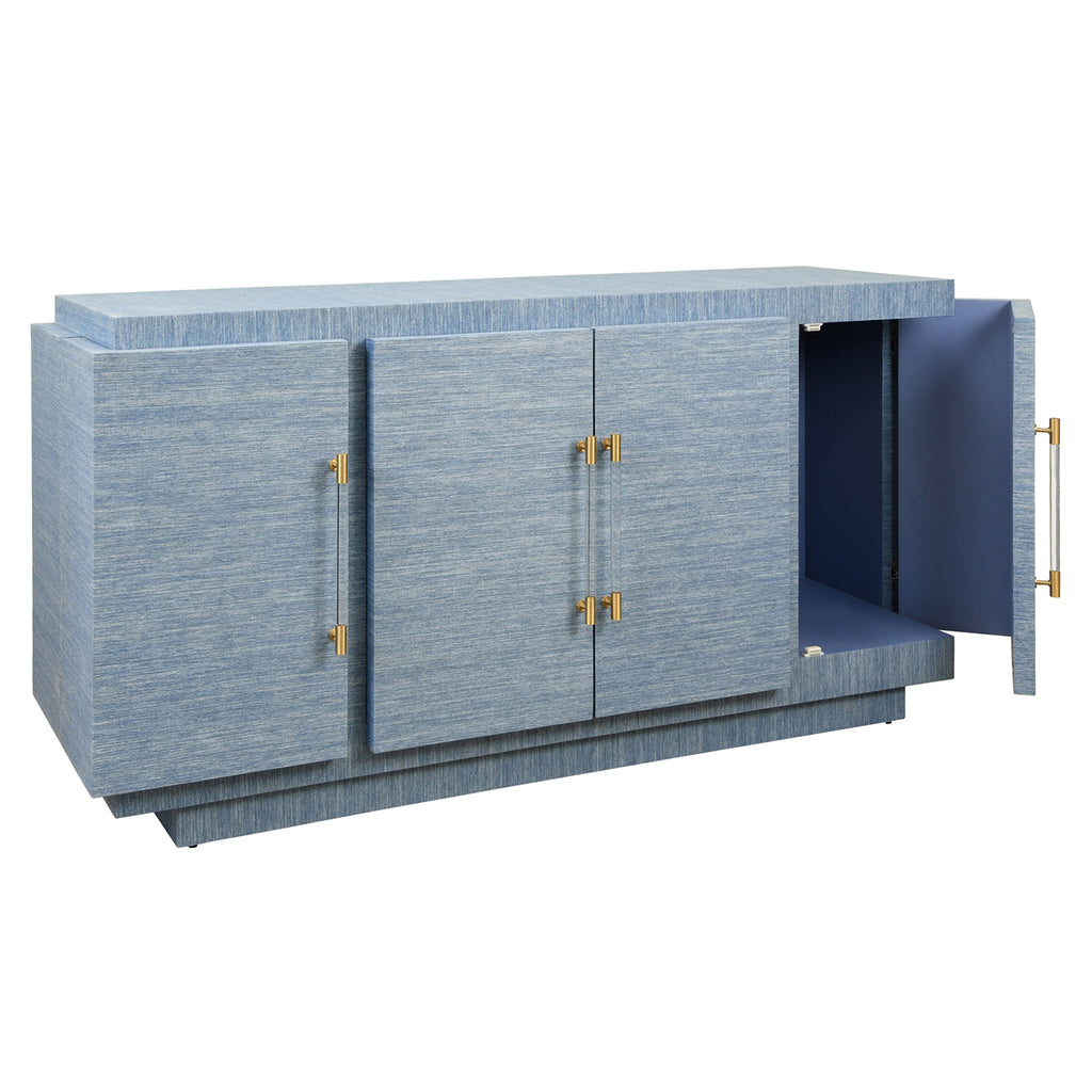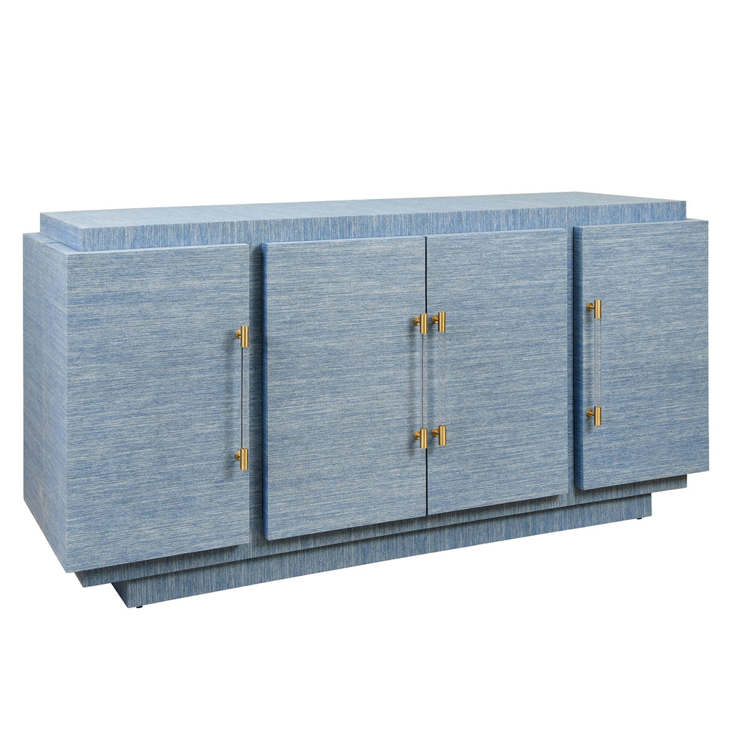 Four door wrap around modern buffet with brass fluted handles in dyed blue grasscloth