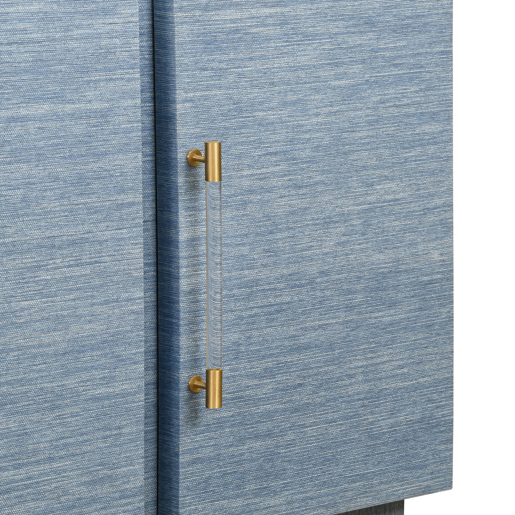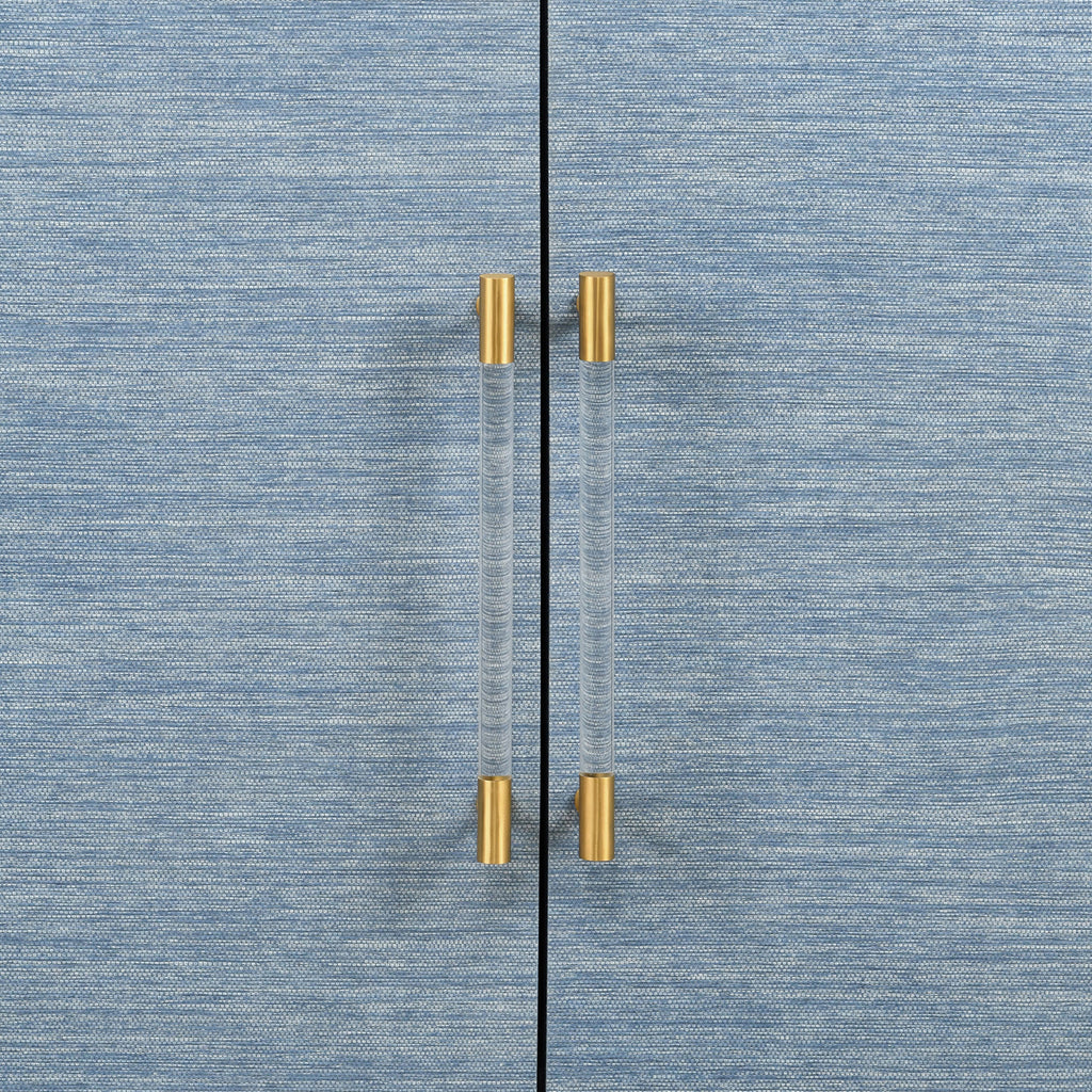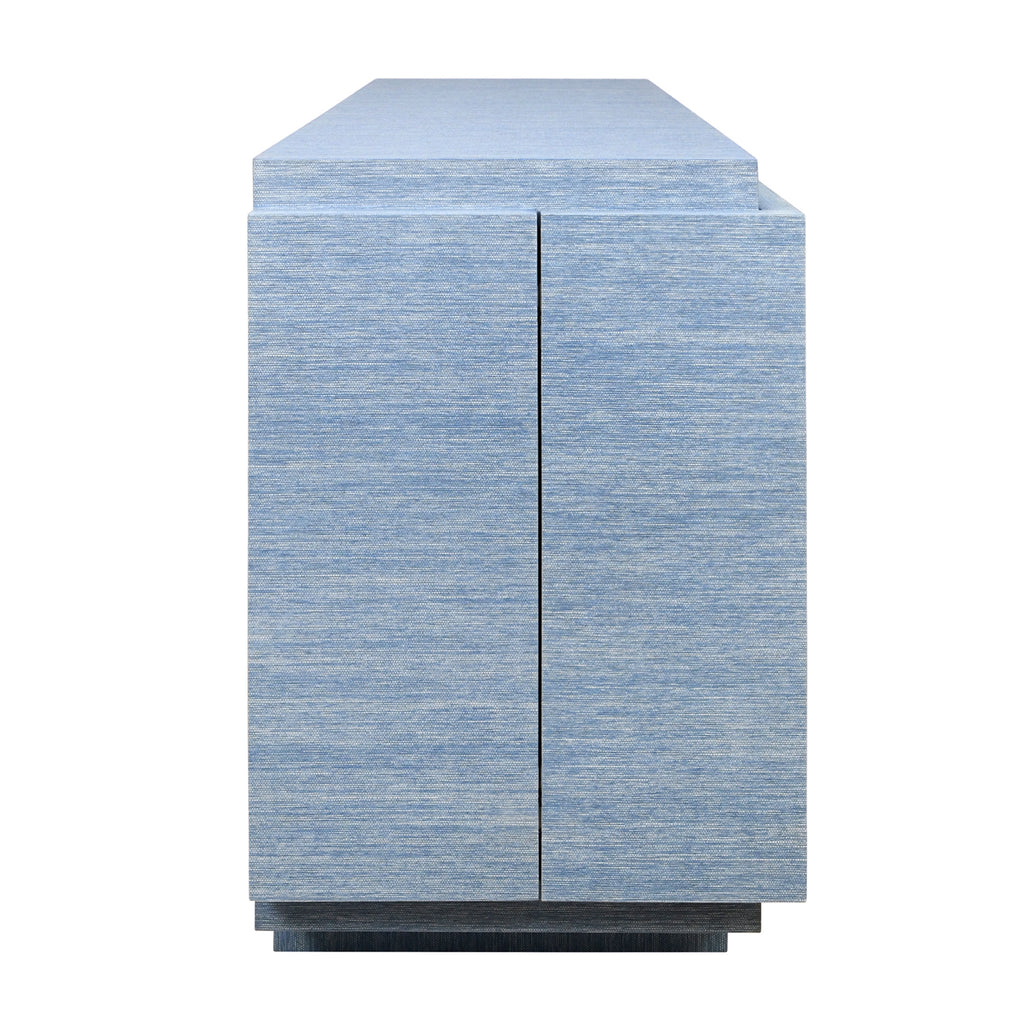 Four door wrap around modern buffet with brass fluted handles in dyed blue grasscloth